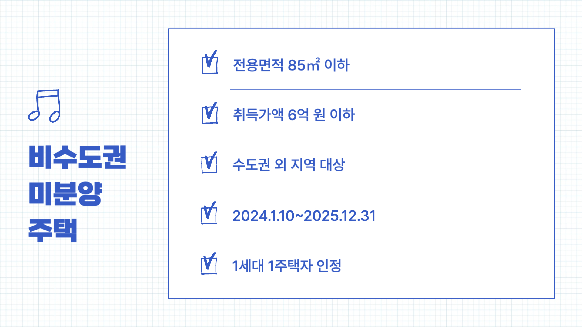 - 비수도권 미분양주택: 2024년 1월 10일부터 2025년 12월 31일 사이에 수도권 밖의 준공 후 미분양 주택(전용면적 85㎡, 취득가액 6억 원 이하)을 취득하면, 1세대 1주택자로 인정되어 양도소득세 비과세 및 종합부동산세 혜택을 받을 수 있습니다.