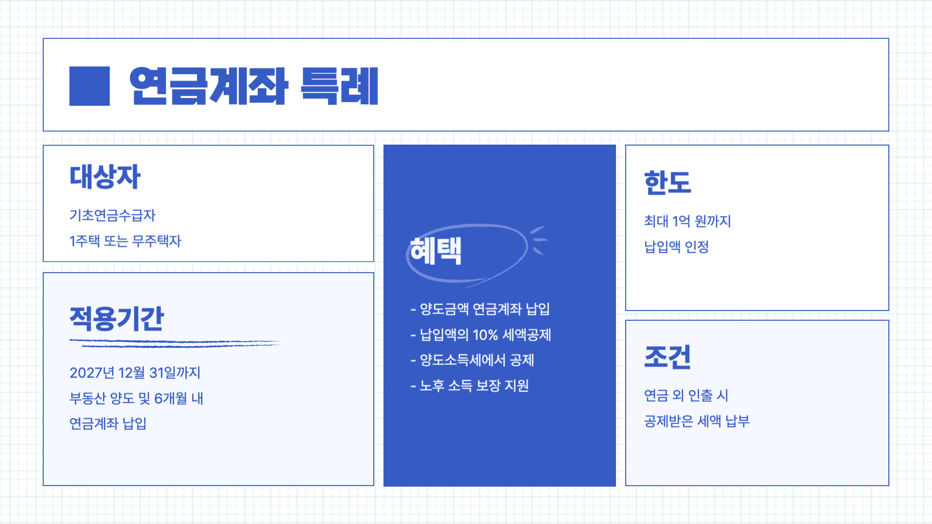 기초연금수급자로서 부동산 양도 당시 1주택 또는 무주택 세대에 속한 거주자가 2027년 12월 31일까지 부동산을 양도하고, 양도일로부터 6개월 이내에 양도 대금의 일부 또는 전부를 연금계좌에 납입하면, 납입액(최대 1억 원)의 10%를 양도소득세에서 공제받을 수 있습니다. 단, 공제받은 금액을 연금 수령 외의 방식으로 인출할 경우, 해당 금액은 다시 양도소득세로 납부해야 합니다.