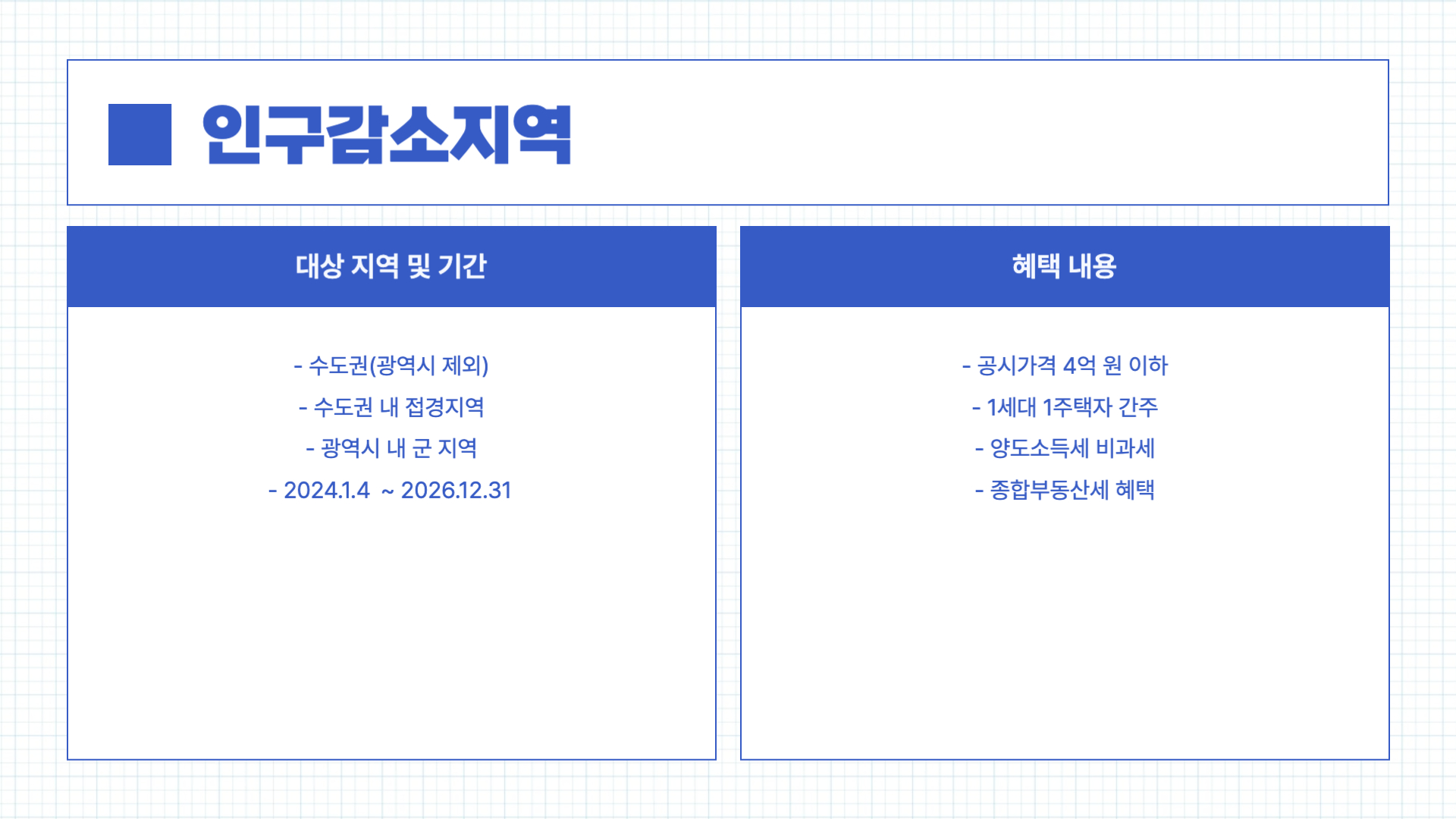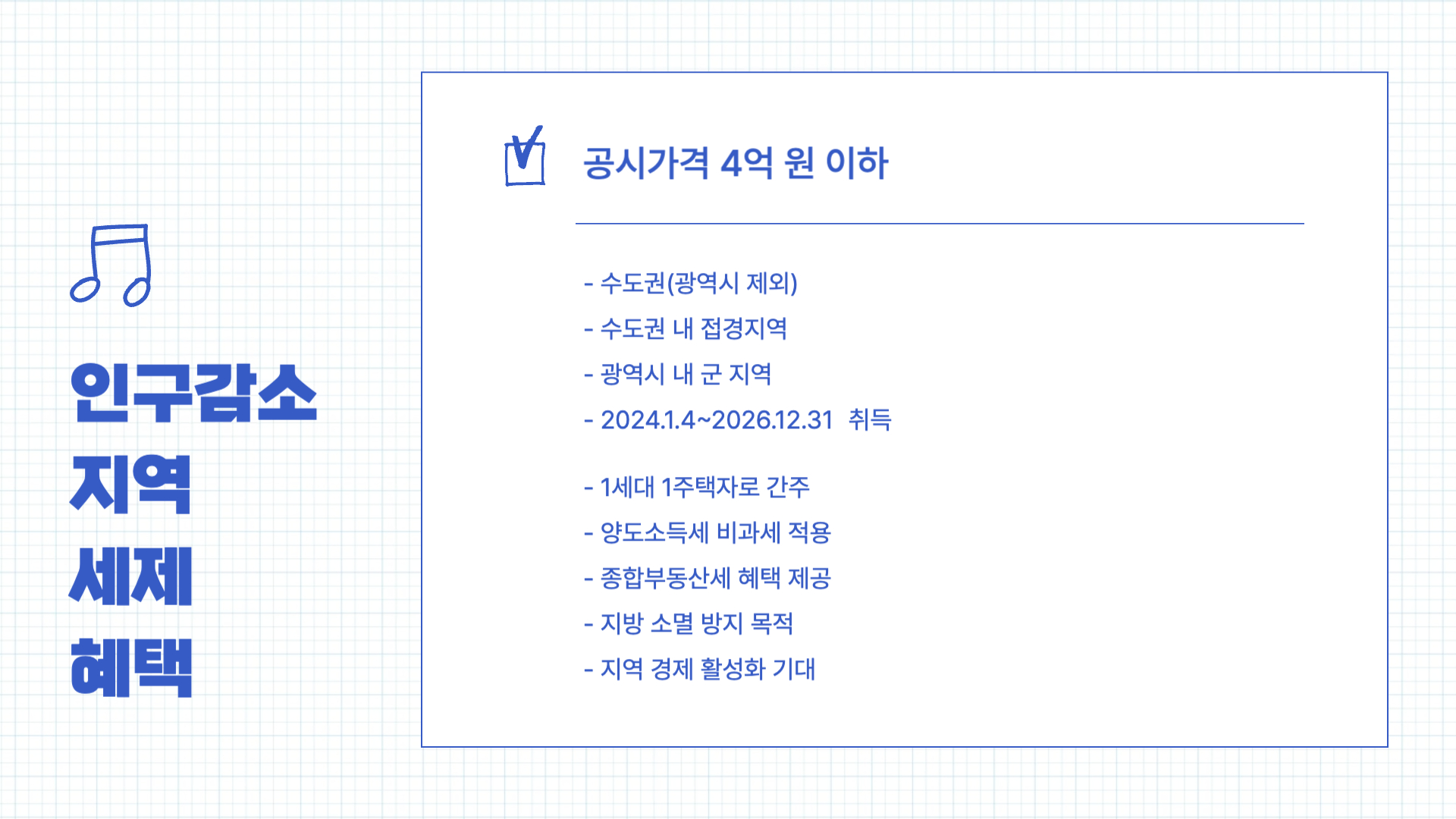 - 인구감소지역: 2024년 1월 4일부터 2026년 12월 31일 사이에 수도권(광역시 제외) 및 수도권 내 접경지역, 광역시 내 군 지역의 공시가격 4억 원 이하 주택을 취득하는 경우, 1세대 1주택자로 간주되어 양도소득세 비과세 및 종합부동산세 혜택을 받을 수 있습니다.