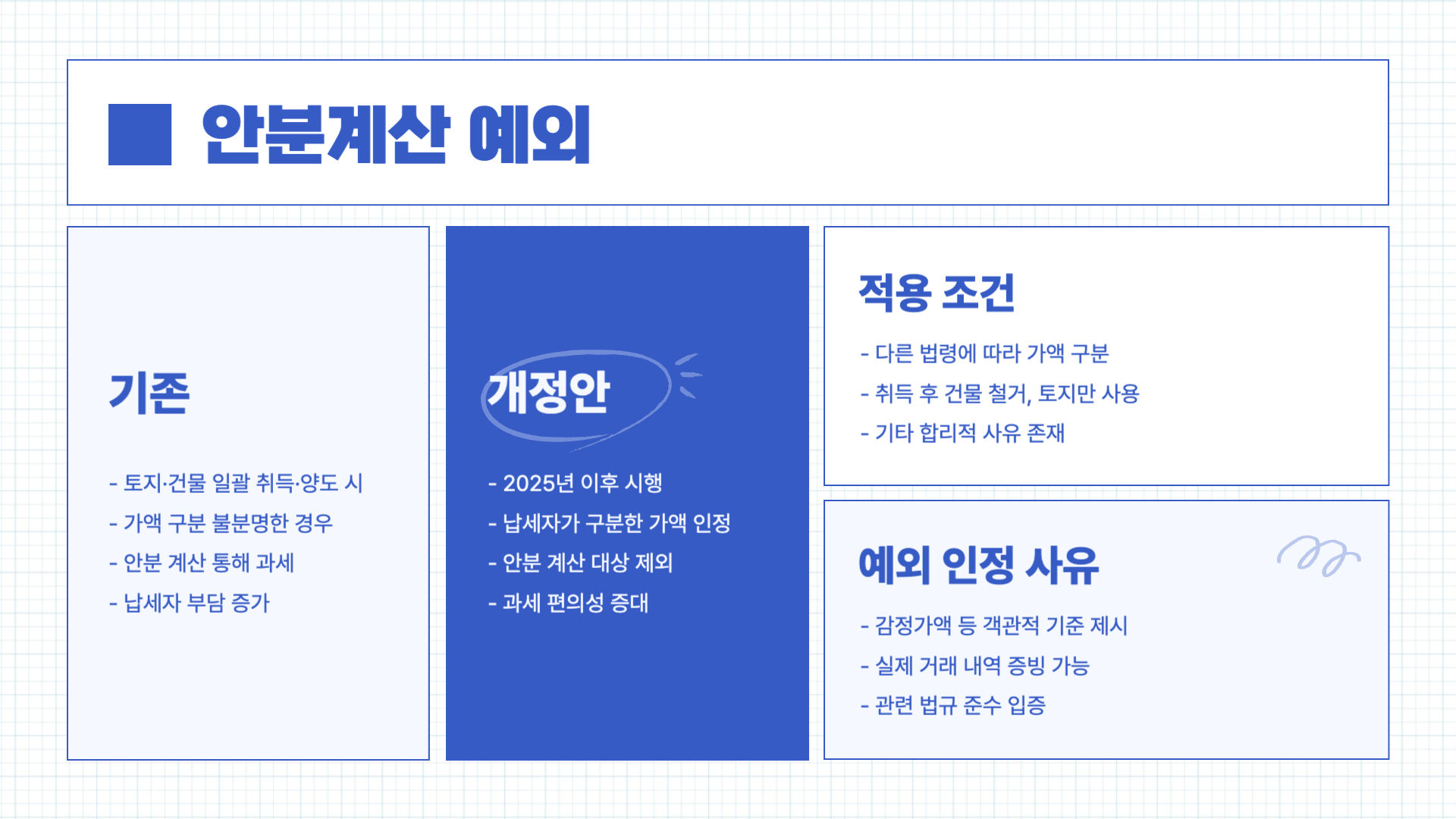 토지와 건물을 함께 취득하거나 양도하는 경우, 기존에는 가액 구분이 불분명하면 안분 계산을 통해 과세하였으나, 2025년 이후에는 납세자가 다른 법령에 따라 가액을 구분한 경우 등 인정할 만한 사유가 있으면 안분 계산 대상에서 제외됩니다.