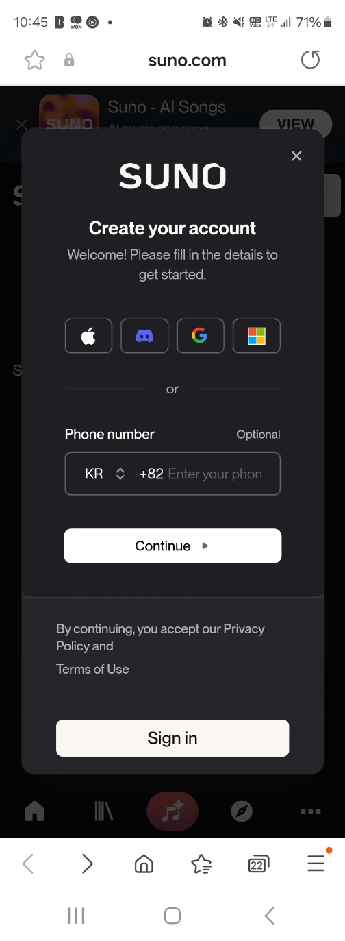 Suno AI 웹사이트에 접속하여 회원 가입을 합니다.