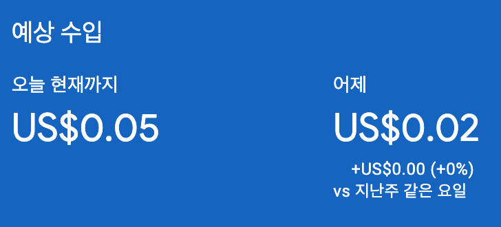 이 글을 쓰는 지금, 제 애드센스 계정에는 하루 수익 0.02$에서 0.06$ 정도가 찍혀 있습니다.