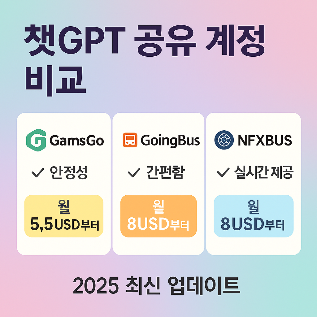 2025년 최신 챗GPT 계정 공유 사이트(GamsGo, GoingBus, NFXBUS) 비교 분석! 가격, 프로모션, 장단점, 추천 대상까지 한눈에 확인하고 저렴하게 ChatGPT Plus를 이용할 수 있는 방법 총정리!
