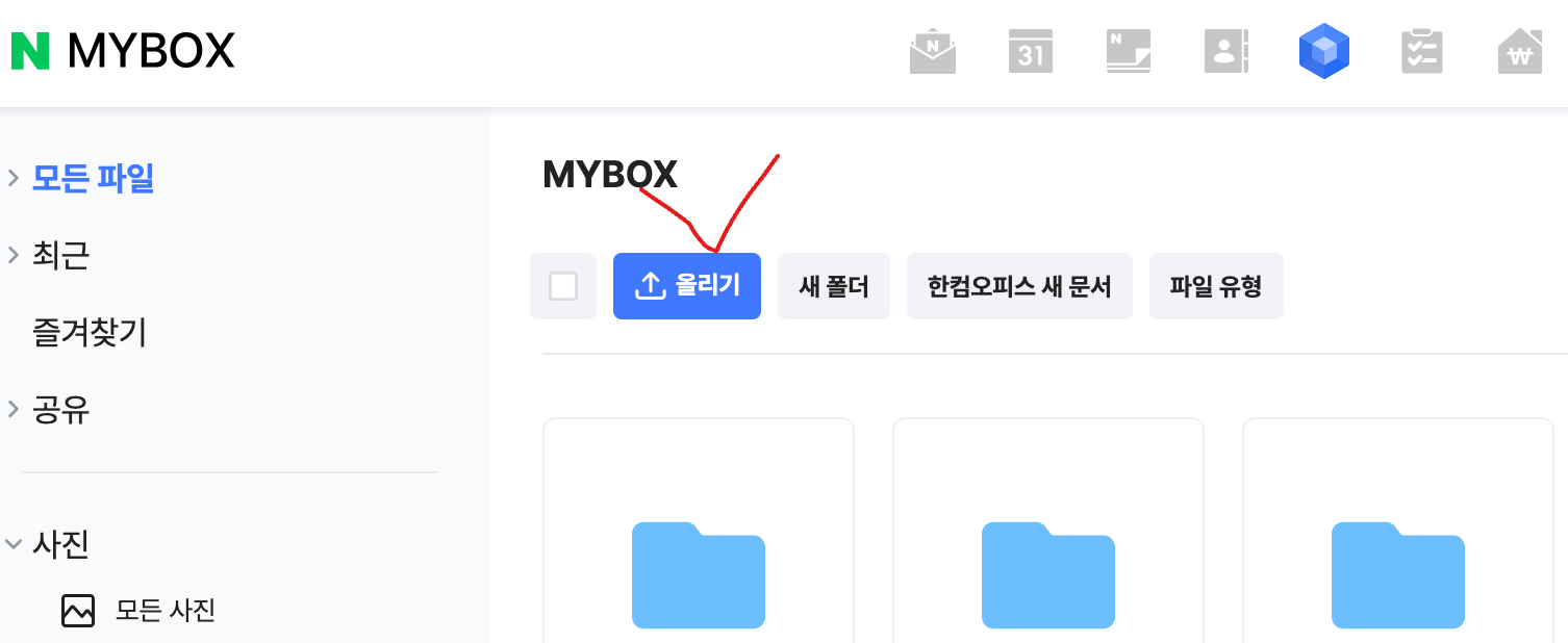- 업로드 버튼 사용: MYBOX 화면 상단의 '업로드' 버튼을 클릭하고 HWP 파일을 선택합니다.