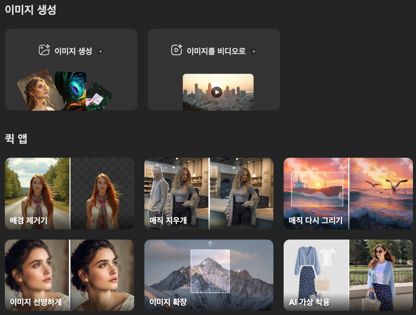 - 비디오 생성 : 이미지를 이용한여 간단함 프롬프트 작성만으로 해당 사진을 이용하여 간단한 동영상 작성 기능을 제공합니다.