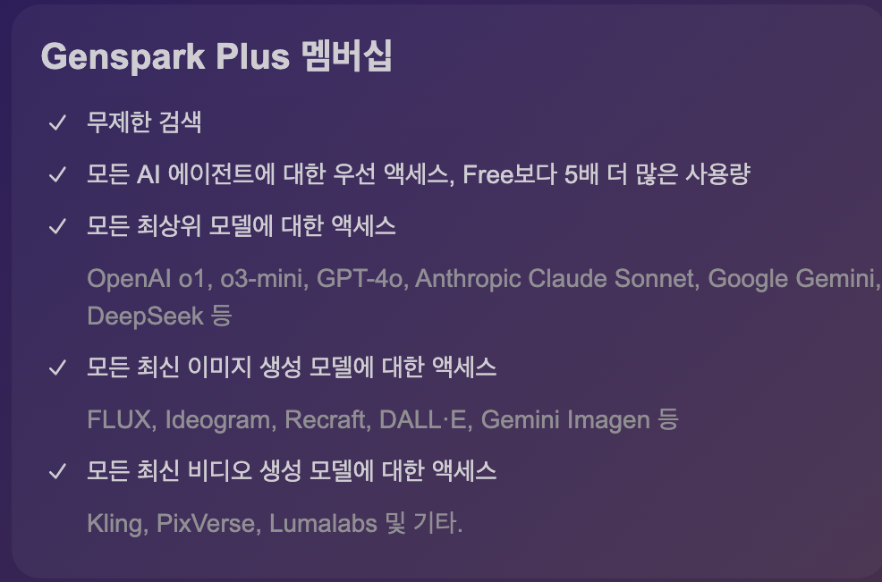 Genspark Plus는 기본 버전보다 더 많은 기능과 향상된 성능을 제공하는 프리미엄 서비스입니다: