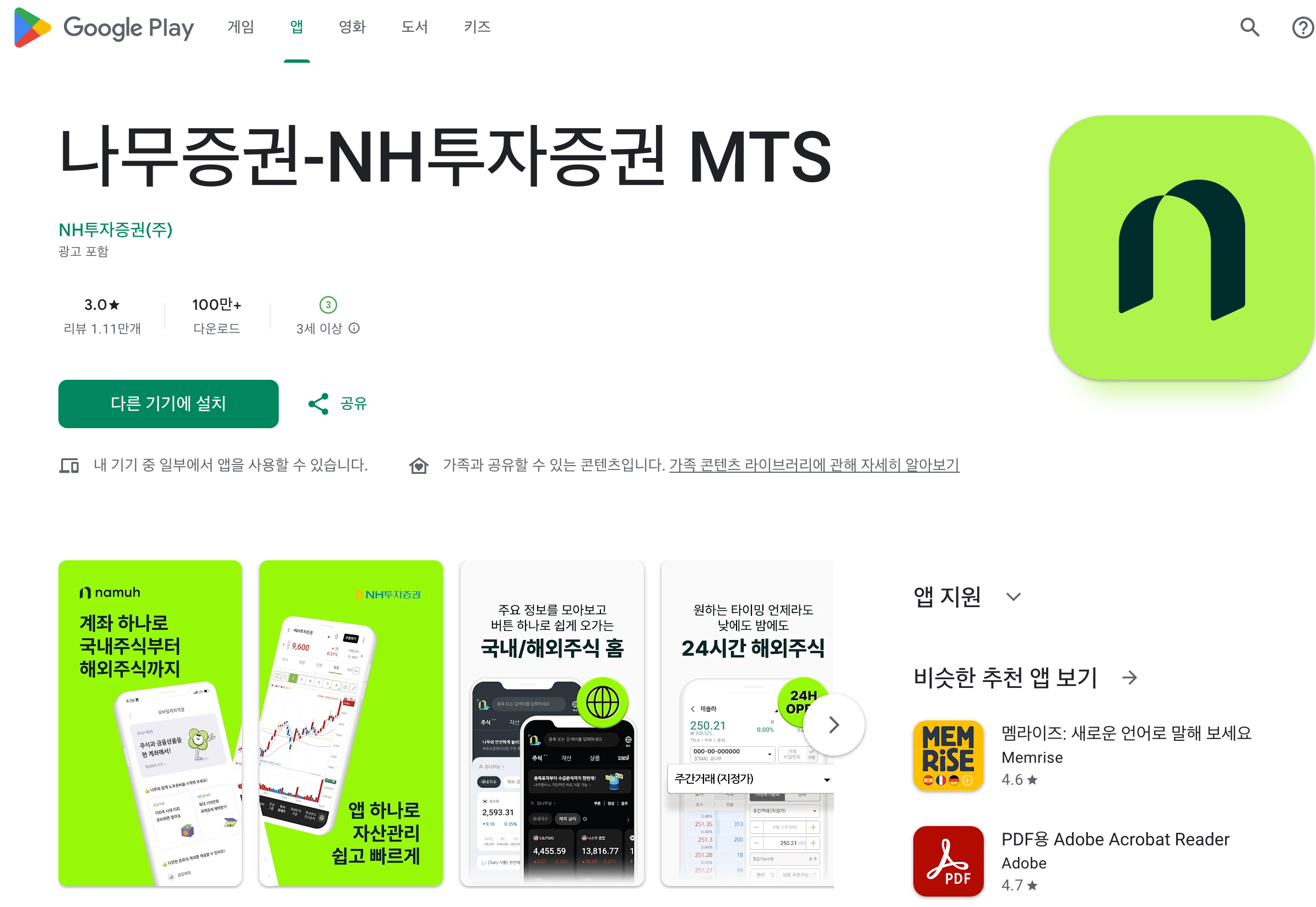 - 안드로이드: Play Store에서 'NH투자증권' 또는 '나무증권' 검색
