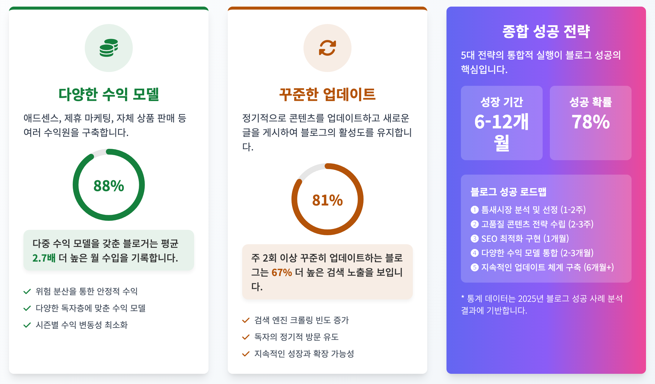 - 다양한 수익 모델: 애드센스, 제휴 마케팅, 자체 상품 판매 등 여러 수익원을 구축합니다.