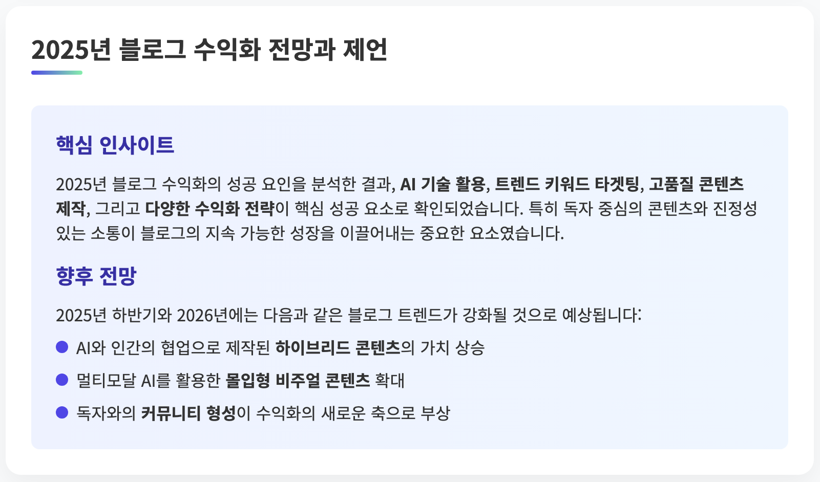 이 가이드는 현실적인 목표 설정과 체계적인 접근 방식을 통해 블로그 수익화의 여정을 안내 할 것입니다. 성공적인 블로그 운영을 위한 긍정적인 마음가짐, 차별화된 콘텐츠 제작, 그리고 꾸준함의 중요성을 항상 명심해야 합니다.