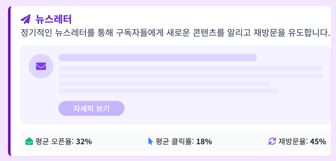 - 뉴스레터: 정기적인 뉴스레터를 통해 구독자들에게 새로운 콘텐츠를 알리고 재방문을 유도합니다.