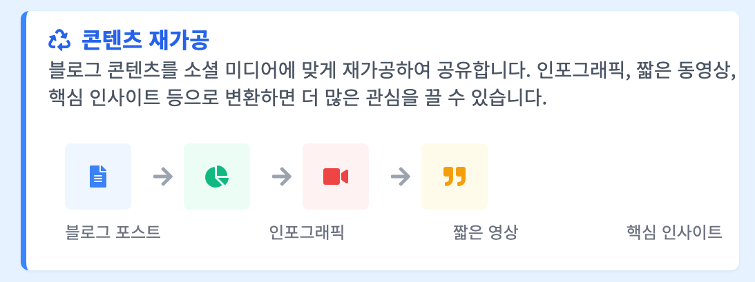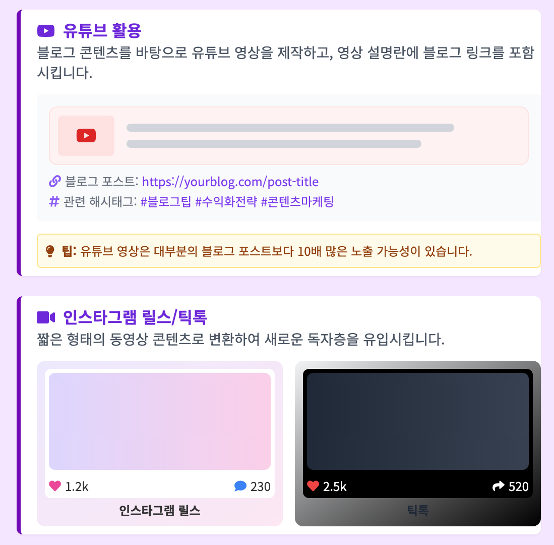 - 인스타그램 릴스/틱톡: 짧은 형태의 동영상 콘텐츠로 변환하여 새로운 독자층을 유입시킵니다.