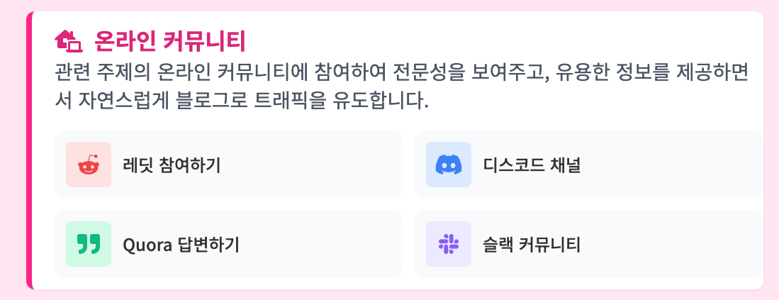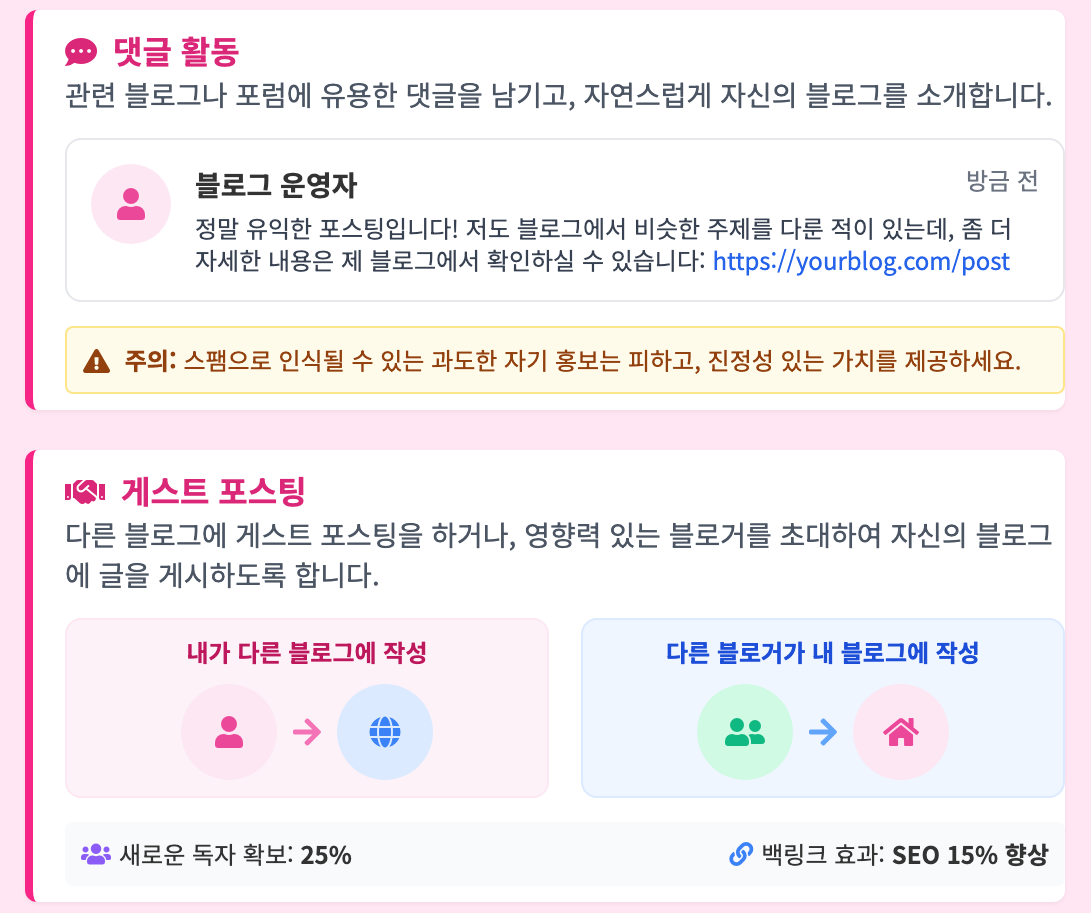 - 댓글 활동: 관련 블로그나 포럼에 유용한 댓글을 남기고, 자연스럽게 자신의 블로그를 소개합니다.