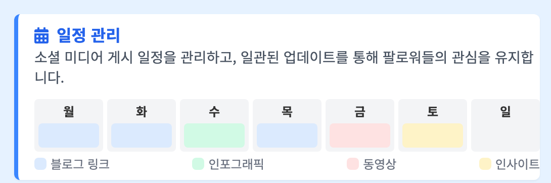 - 일정 관리: 소셜 미디어 게시 일정을 관리하고, 일관된 업데이트를 통해 팔로워들의 관심을 유지합니다.