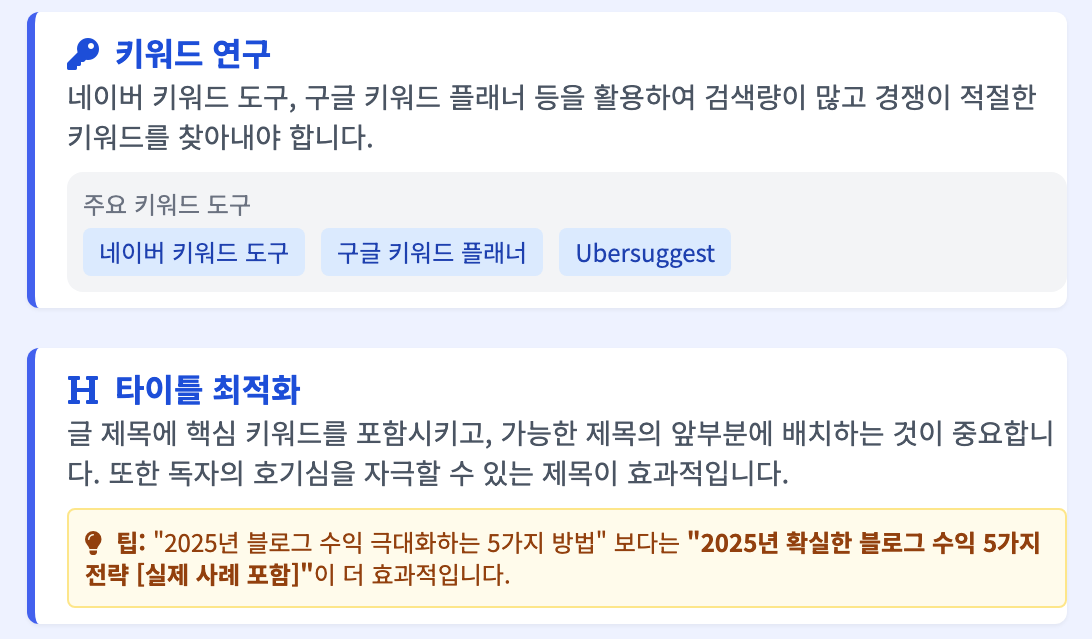 - 타이틀 최적화: 글 제목에 핵심 키워드를 포함시키고, 가능한 제목의 앞부분에 배치하는 것이 중요합니다. 또한 독자의 호기심을 자극할 수 있는 제목이 효과적입니다.