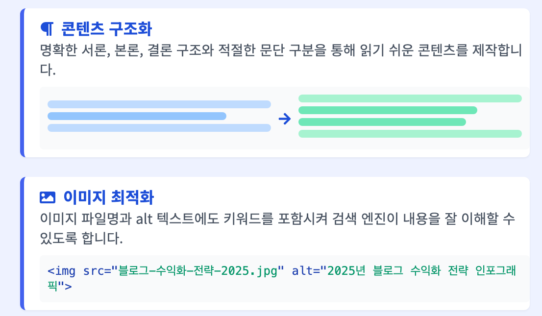 - 이미지 최적화: 이미지 파일명과 alt 텍스트에도 키워드를 포함시켜 검색 엔진이 내용을 잘 이해할 수 있도록 합니다.