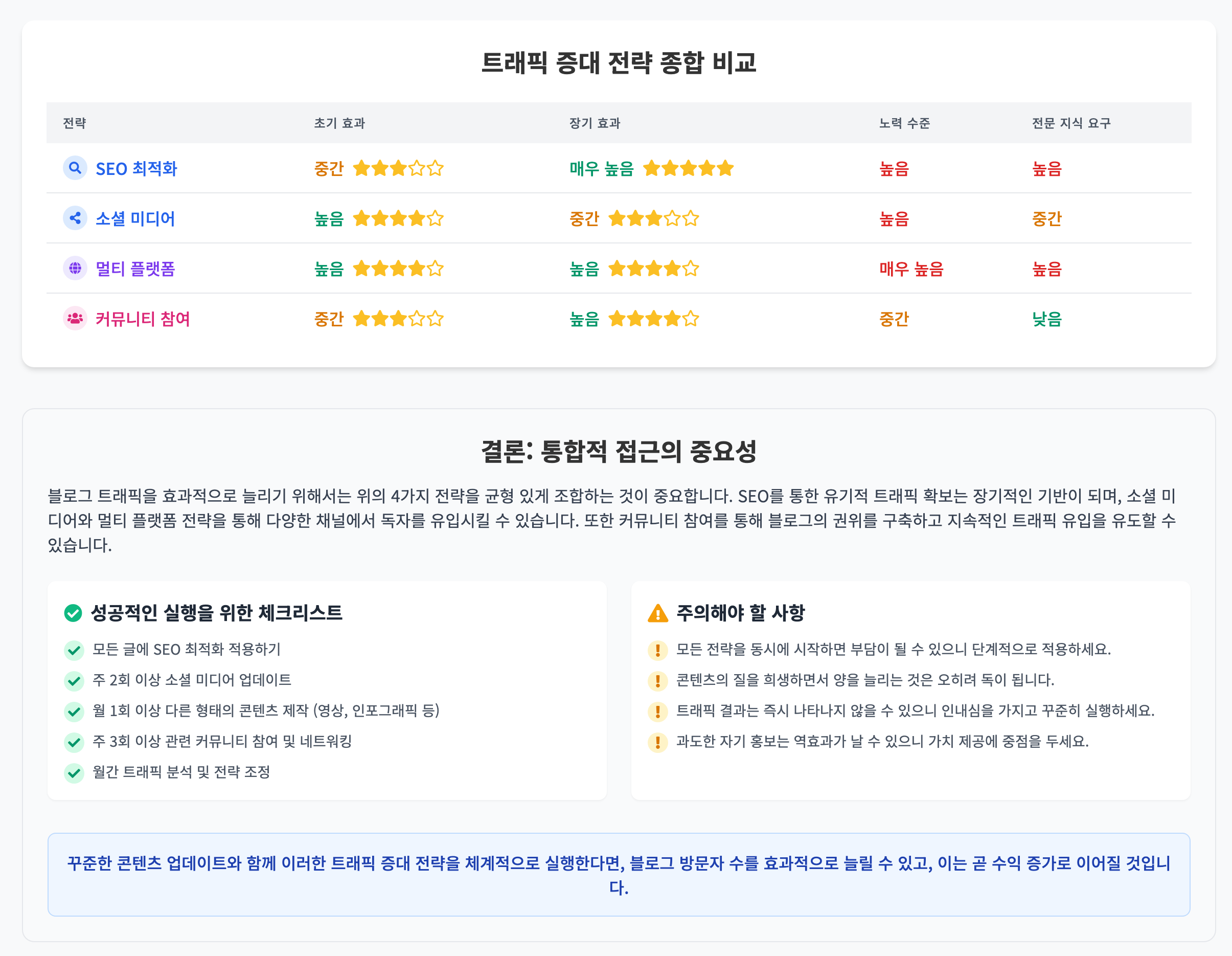 꾸준한 콘텐츠 업데이트와 함께 이러한 트래픽 증대 전략을 체계적으로 실행한다면, 블로그 방문자 수를 효과적으로 늘릴 수 있고, 이는 곧 수익 증가로 이어질 것입니다.