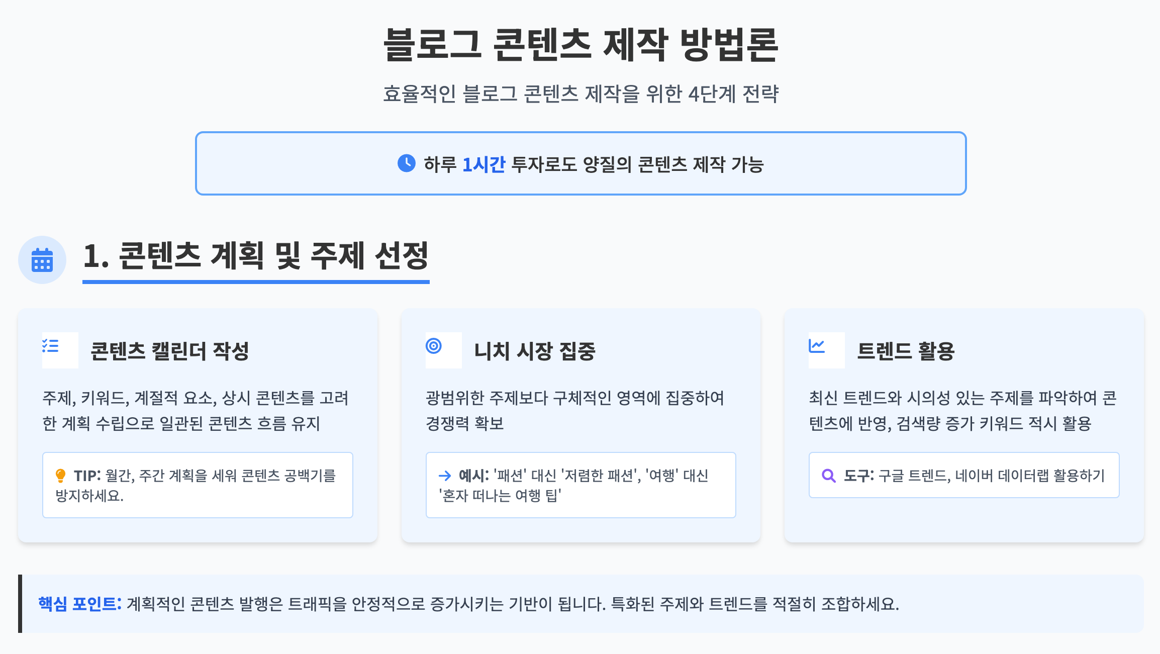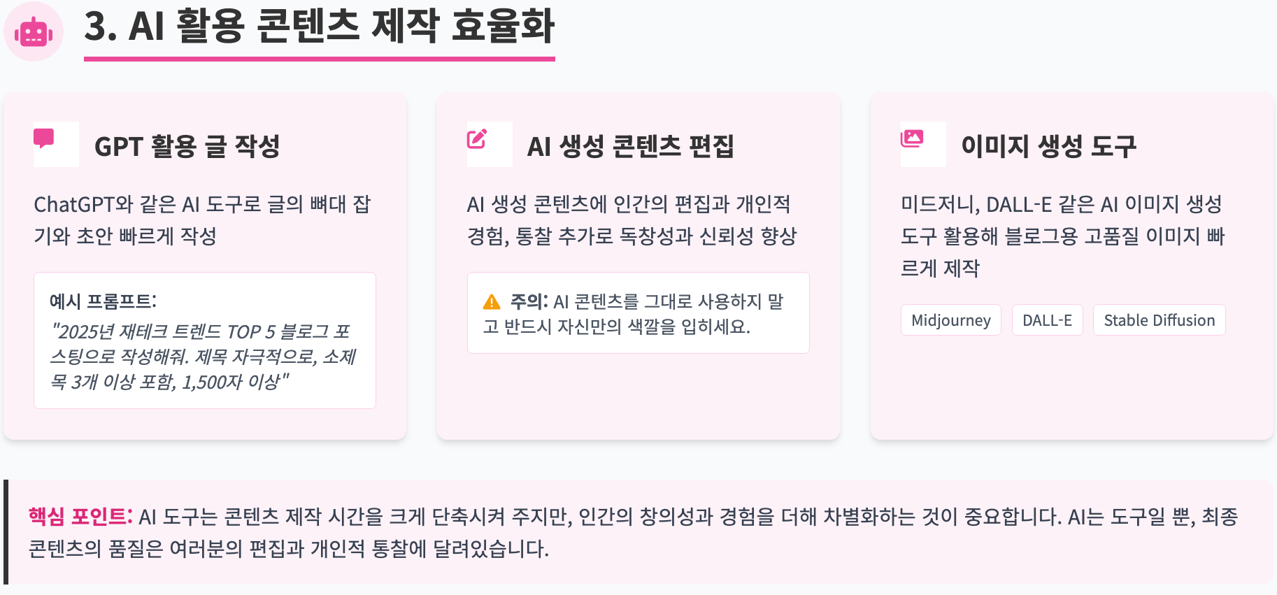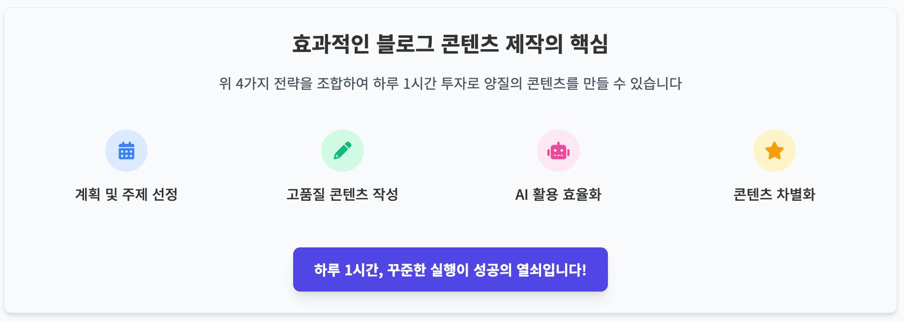 효율적인 콘텐츠 제작 방법론을 통해 하루 1시간 투자로도 양질의 콘텐츠를 꾸준히 발행할 수 있으며, 이는 블로그의 성장과 수익화에 큰 도움이 될 것입니다.