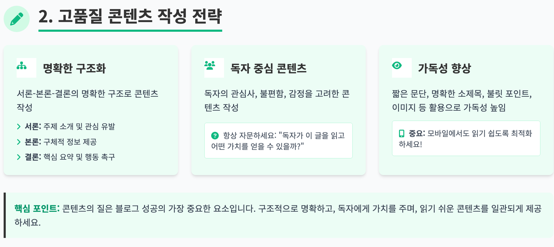 - 독자 중심 콘텐츠: 독자의 관심사, 불편함, 감정을 고려한 콘텐츠를 작성합니다. "독자가 이 글을 읽고 어떤 가치를 얻을 수 있을까?"라는 질문을 항상 염두에 두어야 합니다.