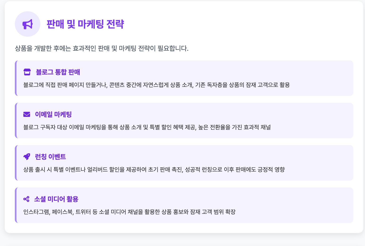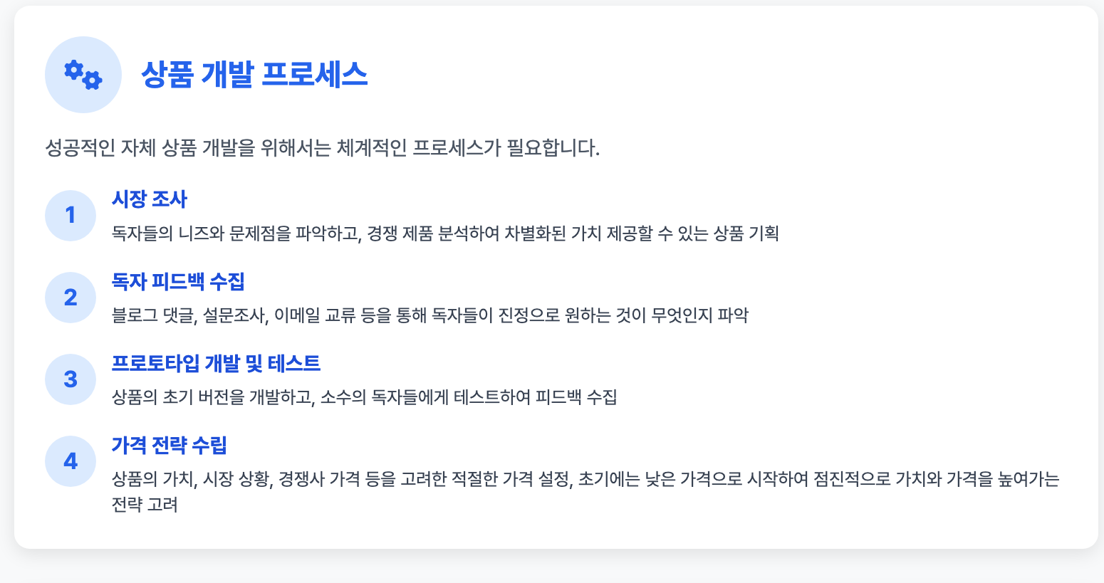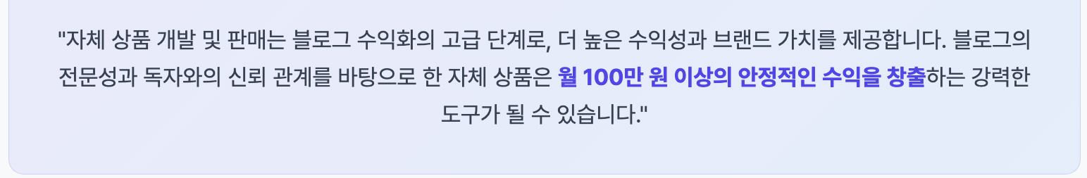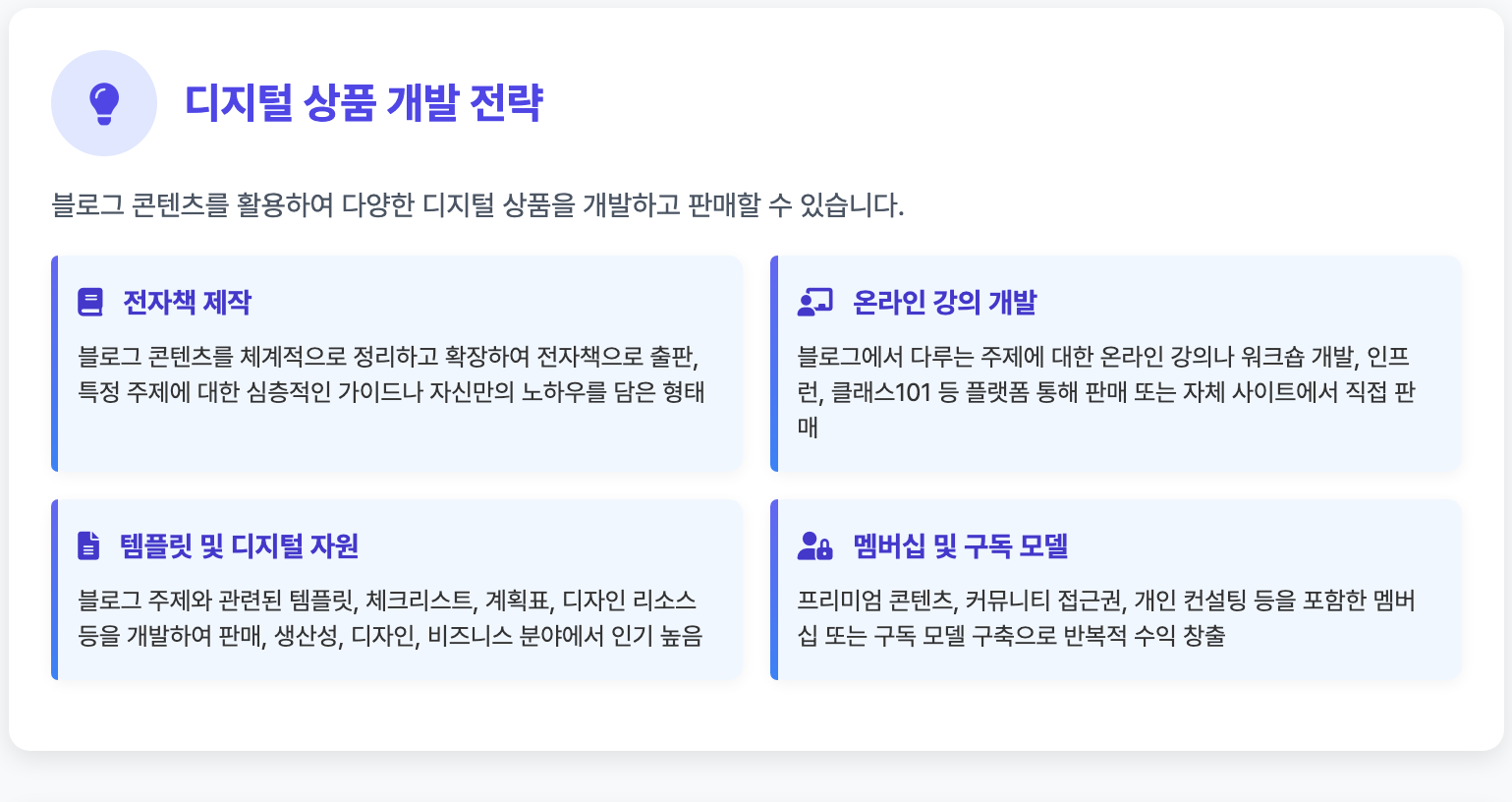 자체 상품 개발 및 판매는 블로그 수익화의 고급 단계로, 더 높은 수익성과 브랜드 가치를 제공합니다. 블로그의 전문성과 독자와의 신뢰 관계를 바탕으로 한 자체 상품은 월 100만 원 이상의 안정적인 수익을 창출하는 강력한 도구가 될 수 있습니다.