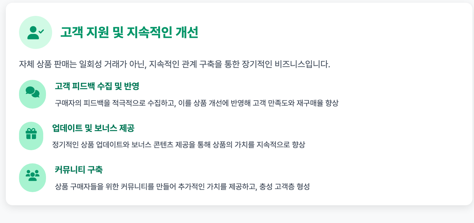 - 업데이트 및 보너스 제공: 정기적인 상품 업데이트와 보너스 콘텐츠 제공을 통해 상품의 가치를 지속적으로 향상시킵니다.