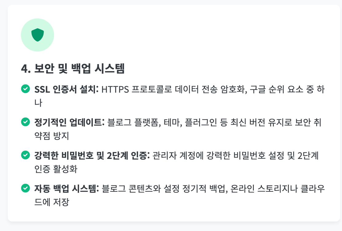 블로그의 보안은 사용자 신뢰와 검색 엔진 순위에 영향을 미칩니다. 또한 정기적인 백업은 데이터 손실을 방지합니다.