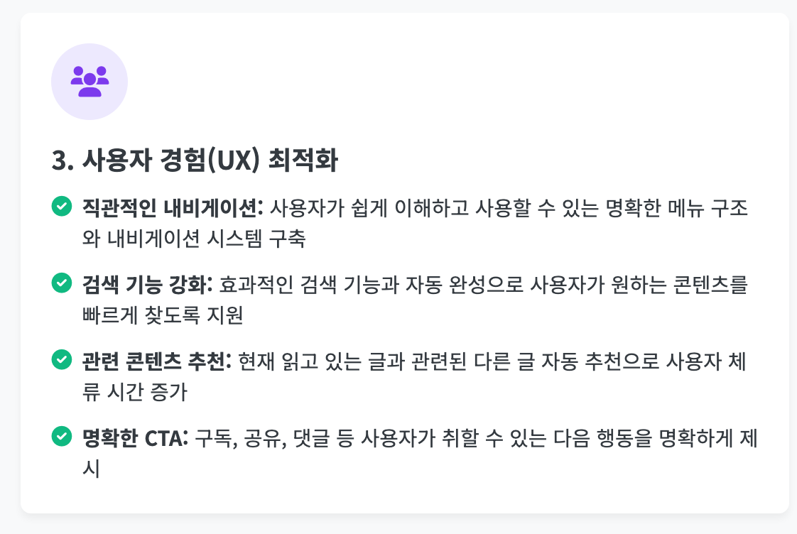 사용자가 블로그에서 원하는 정보를 쉽게 찾고, 편안하게 브라우징할 수 있도록 사용자 경험을 최적화합니다.