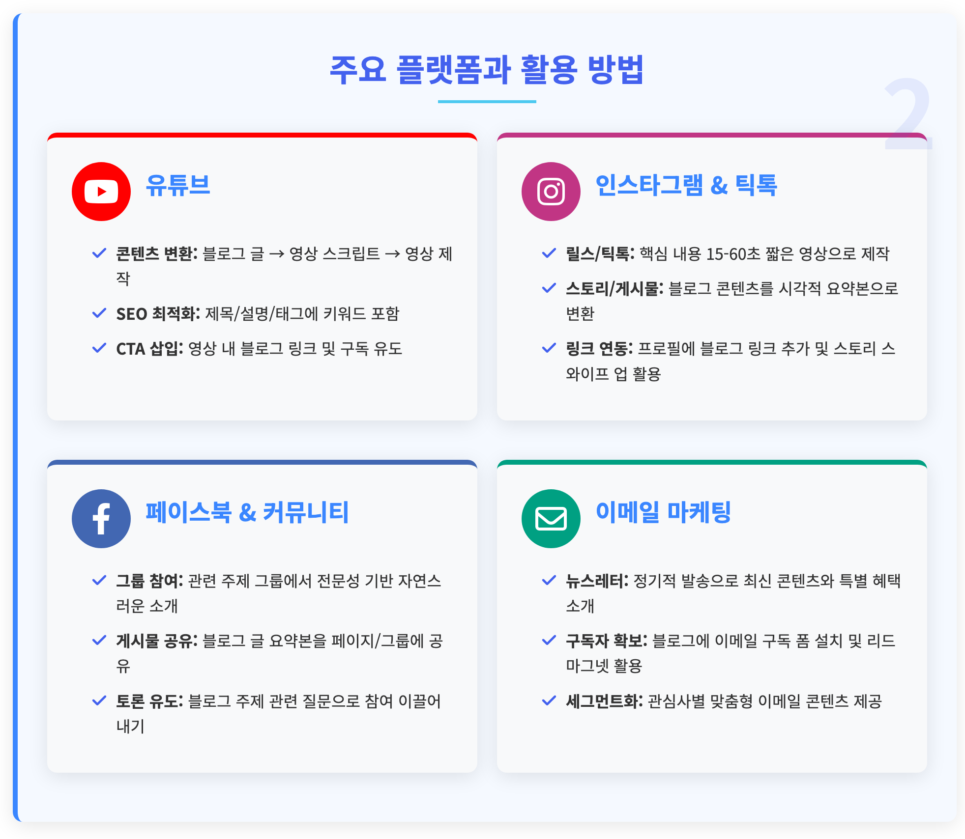 - 콘텐츠 재활용: 기존 블로그 콘텐츠를 재가공하여 여러 플랫폼에서 활용함으로써 효율성을 높일 수 있습니다.