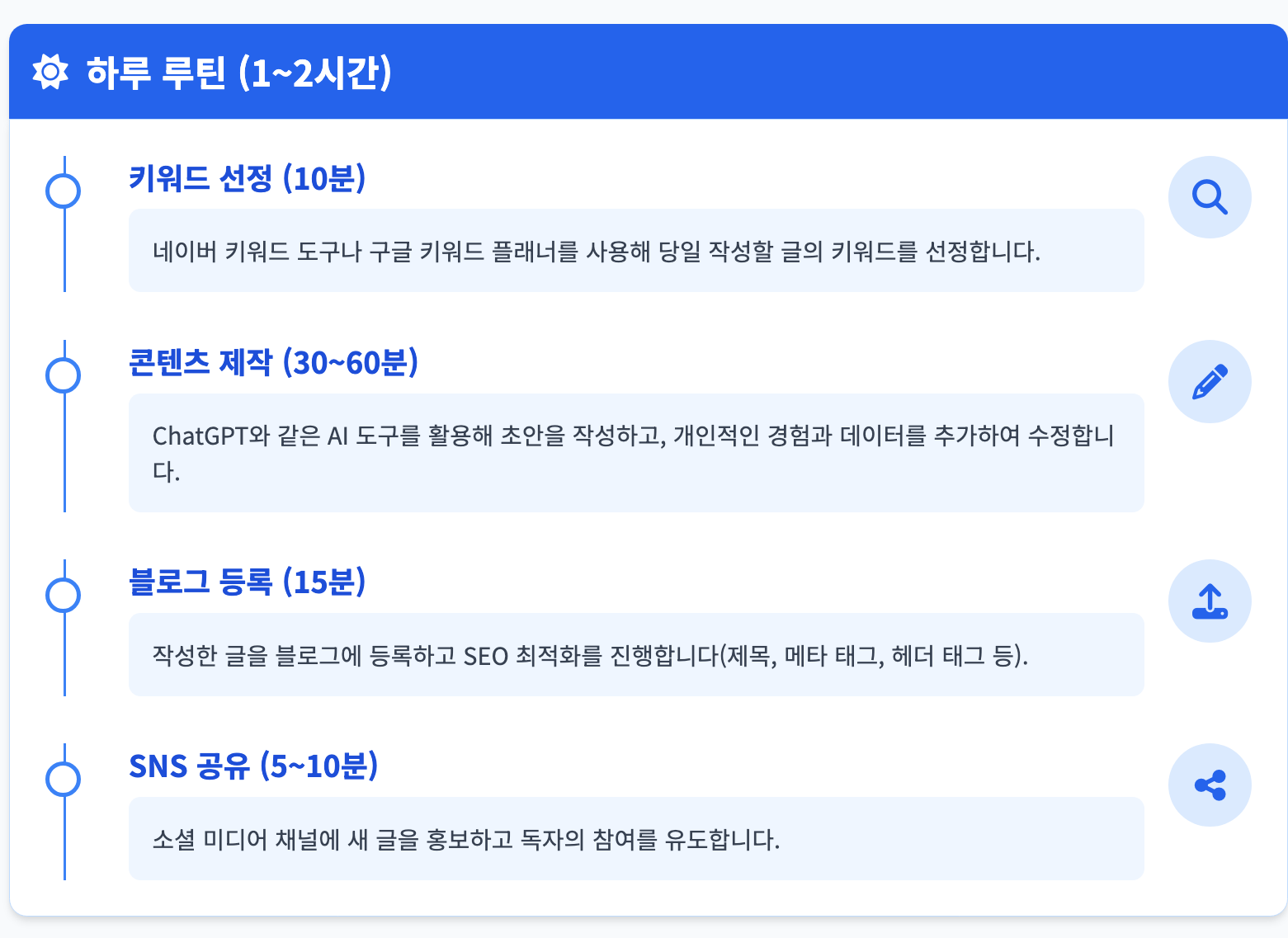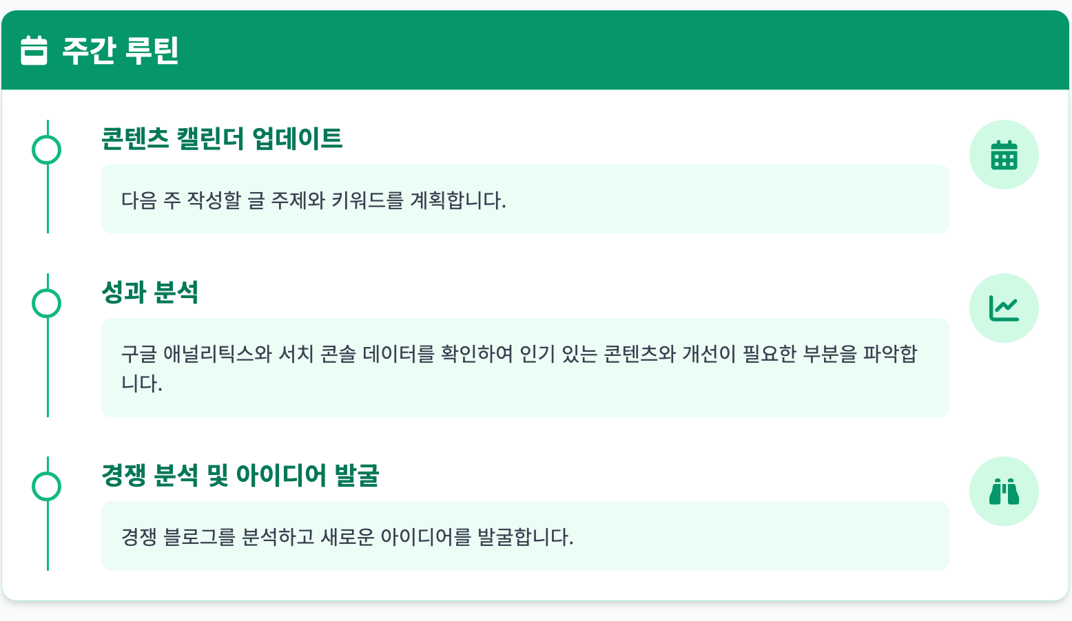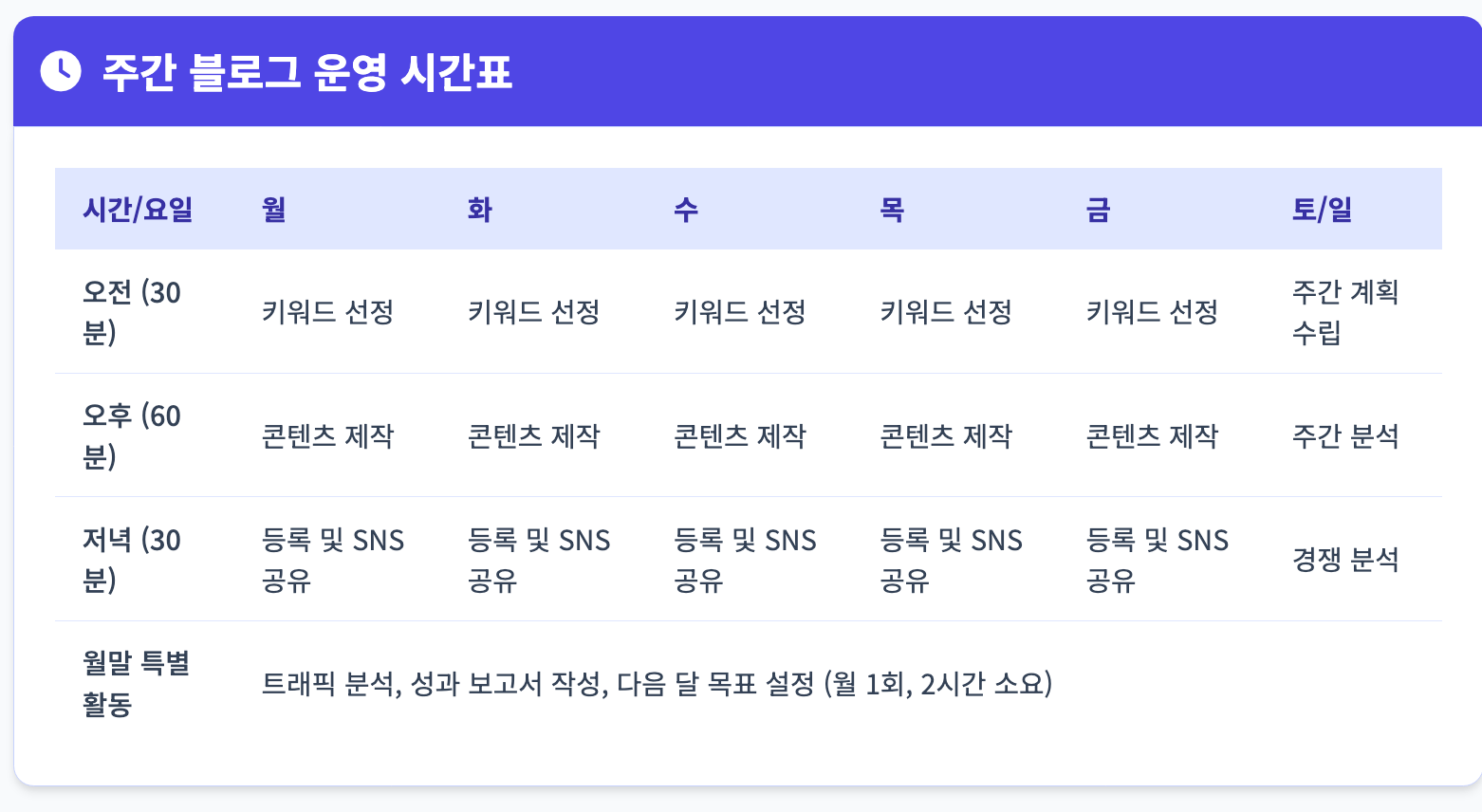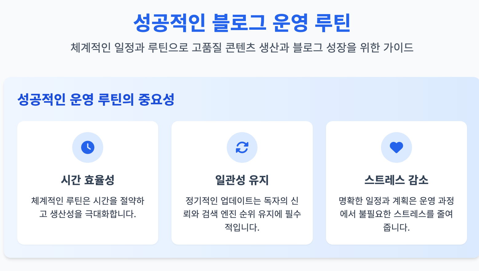 블로그 운영은 체계적인 일정과 루틴을 통해 효율성을 극대화하고, 안정적인 성장을 이루는 것이 중요합니다. 이를 통해 콘텐츠 제작, 트래픽 증대, 수익화를 지속적으로 관리할 수 있습니다.