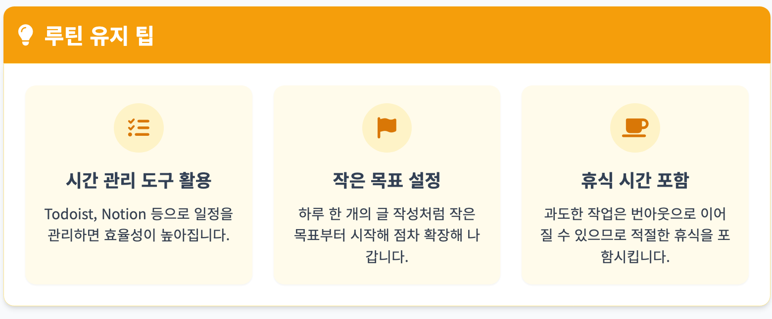 - 작은 목표 설정: 하루 한 개의 글 작성처럼 작은 목표부터 시작해 점차 확장해 나갑니다.