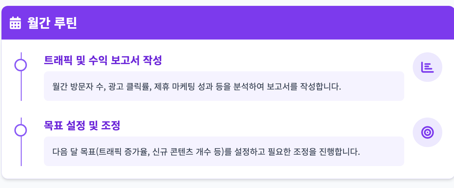 - 다음 달 목표(트래픽 증가율, 신규 콘텐츠 개수 등)를 설정하고 필요한 조정을 진행합니다.