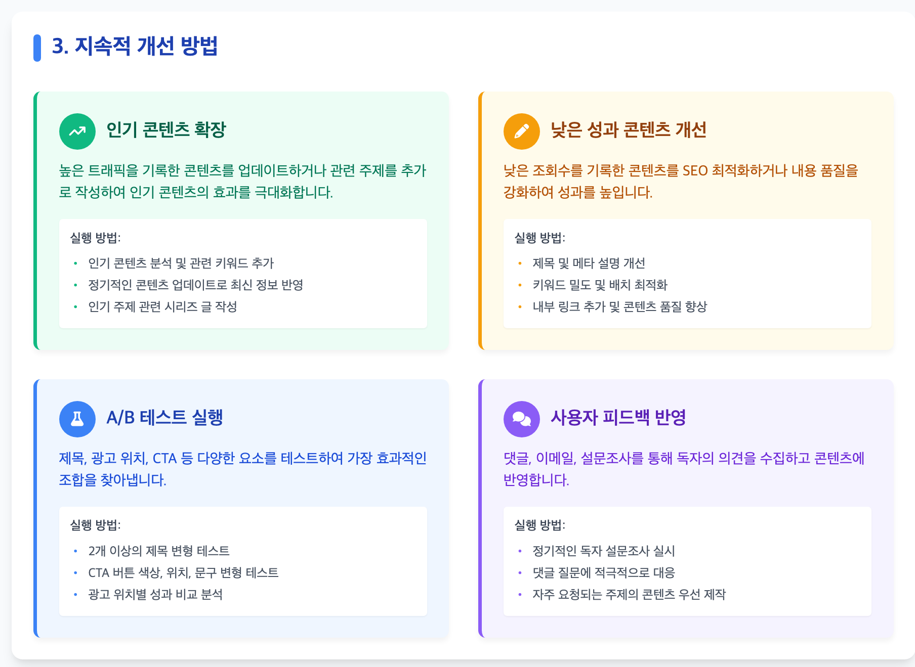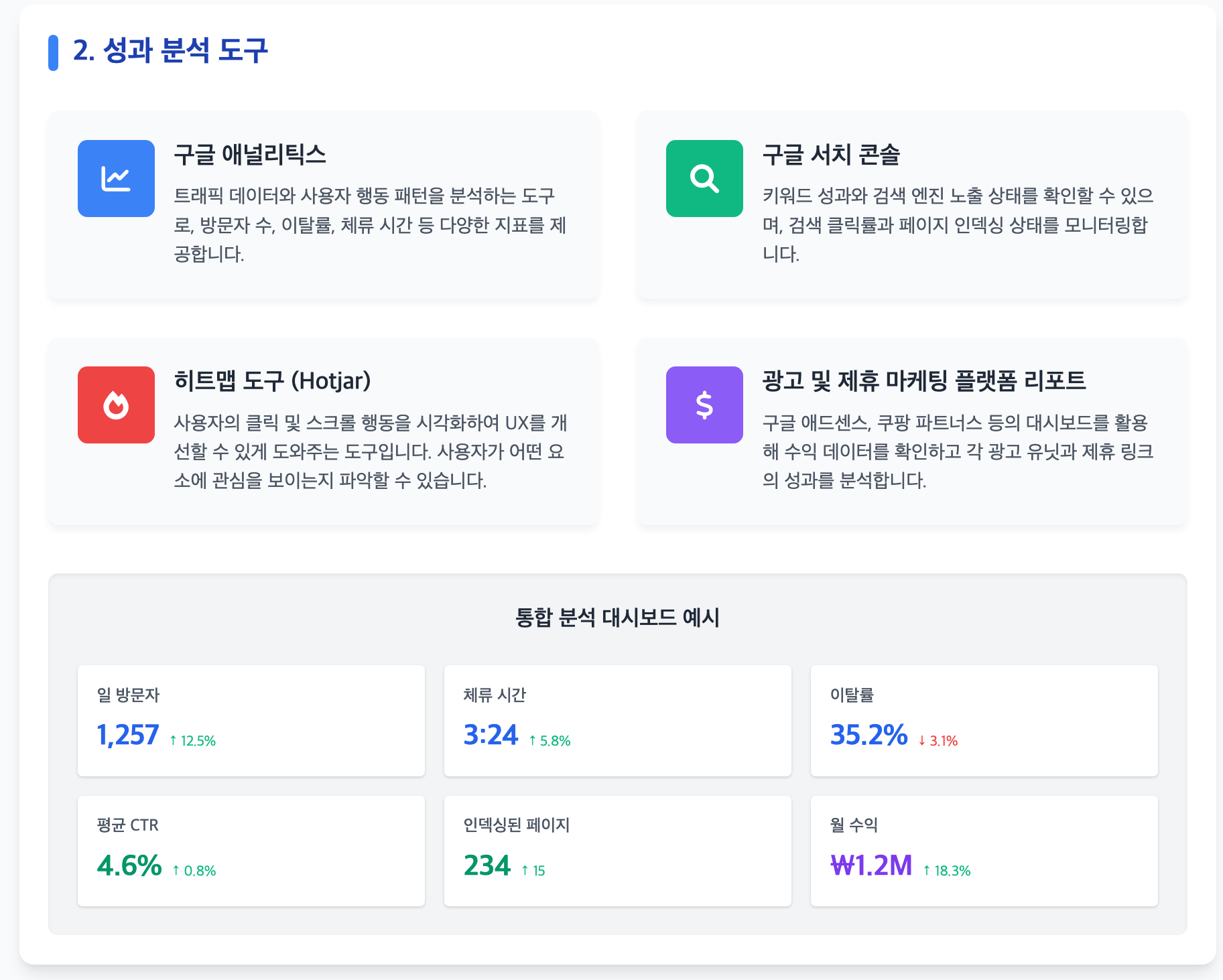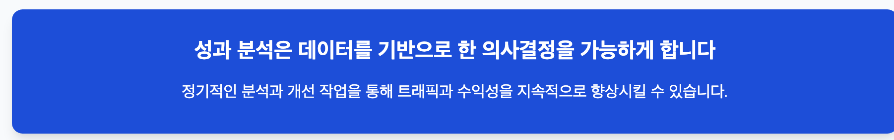 요약: 성과 분석은 데이터를 기반으로 한 의사결정을 가능하게 합니다. 정기적인 분석과 개선 작업을 통해 트래픽과 수익성을 지속적으로 향상시킬 수 있습니다.