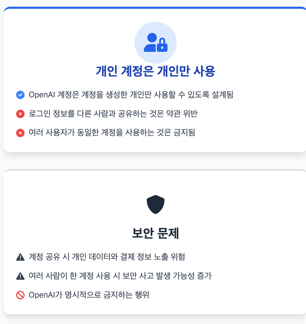 계정을 공유하면 개인 데이터와 결제 정보가 노출될 위험이 있습니다. 특히, 여러 사람이 한 계정을 사용하면 보안 사고가 발생할 가능성이 높아지며, 이는 OpenAI가 금지하는 행위입니다.