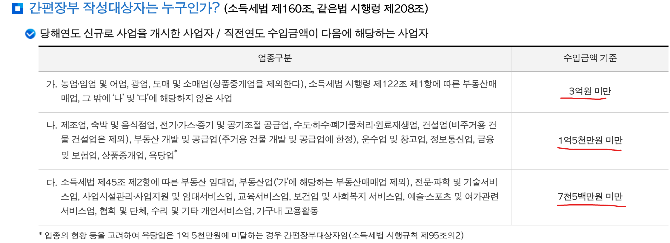 - 장부 작성하면 세액공제: 연매출 7,500만 원 미만 프리랜서는 간편장부 대상이에요. 복식부기로 장부 작성 시 세액공제(20%)도 받을 수 있으니, 장부 작성이 가능하다면 꼭 도전해 보세요. (국세청 기준 업종구분에 따라 간편장부 대상이 다르니 아래 표에서 확인 필요)