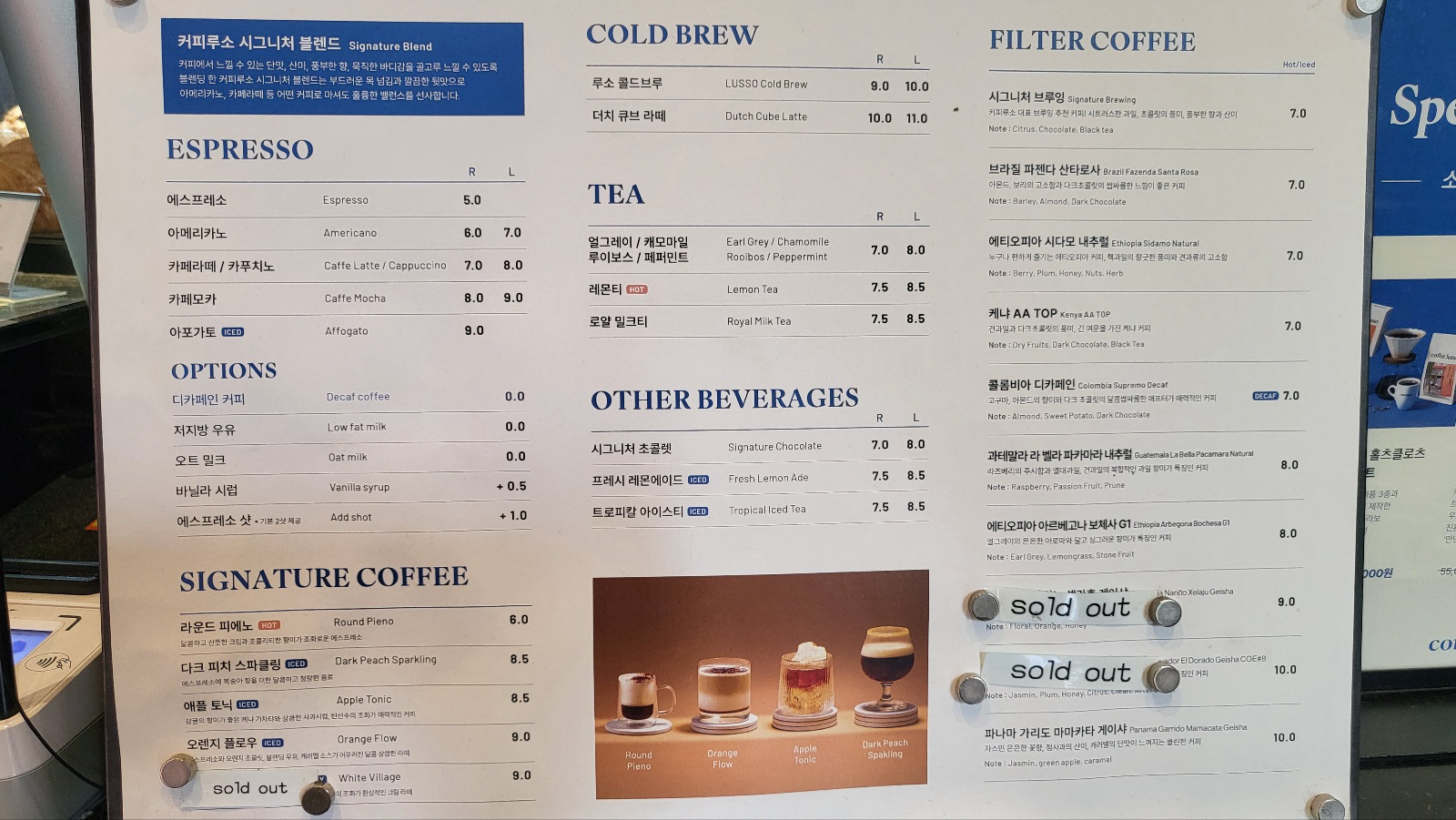 - 시그니처 커피: 라운드 피에노, 시그니처 브루잉, 더치 큐브 라떼