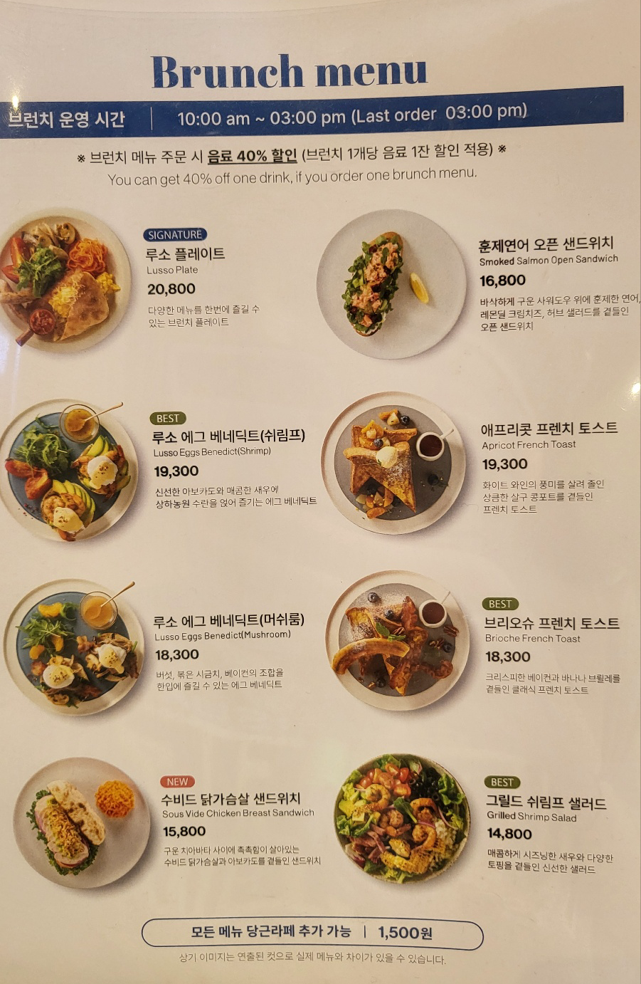 - 브런치: 정동 브런치 플레이트, 쉬림프 에그 베네딕트, 베이컨브리오슈 프렌치토스트