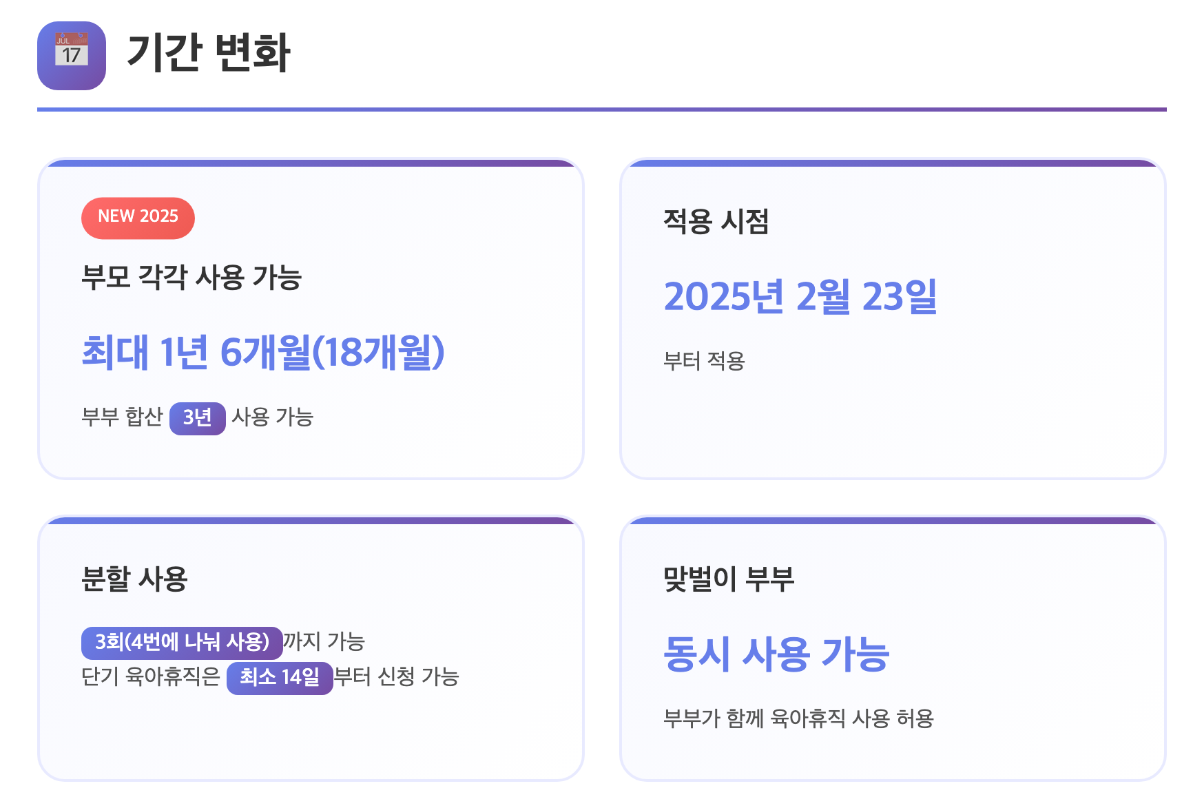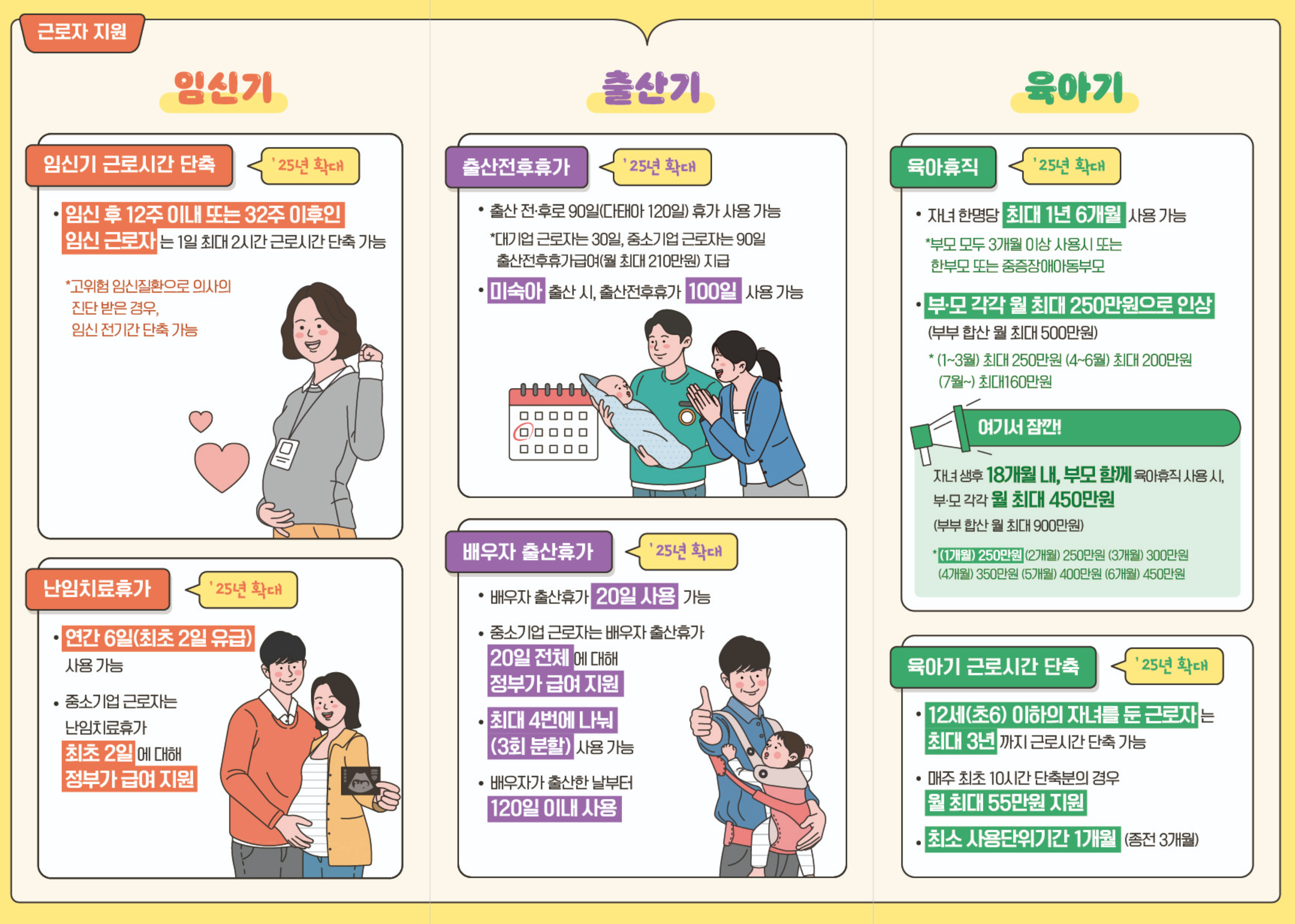 - 2025년부터는 출산휴가와 육아휴직을 한 번에 통합 신청 가능! (출산 후 18개월 이내 육아휴직 사용 시)