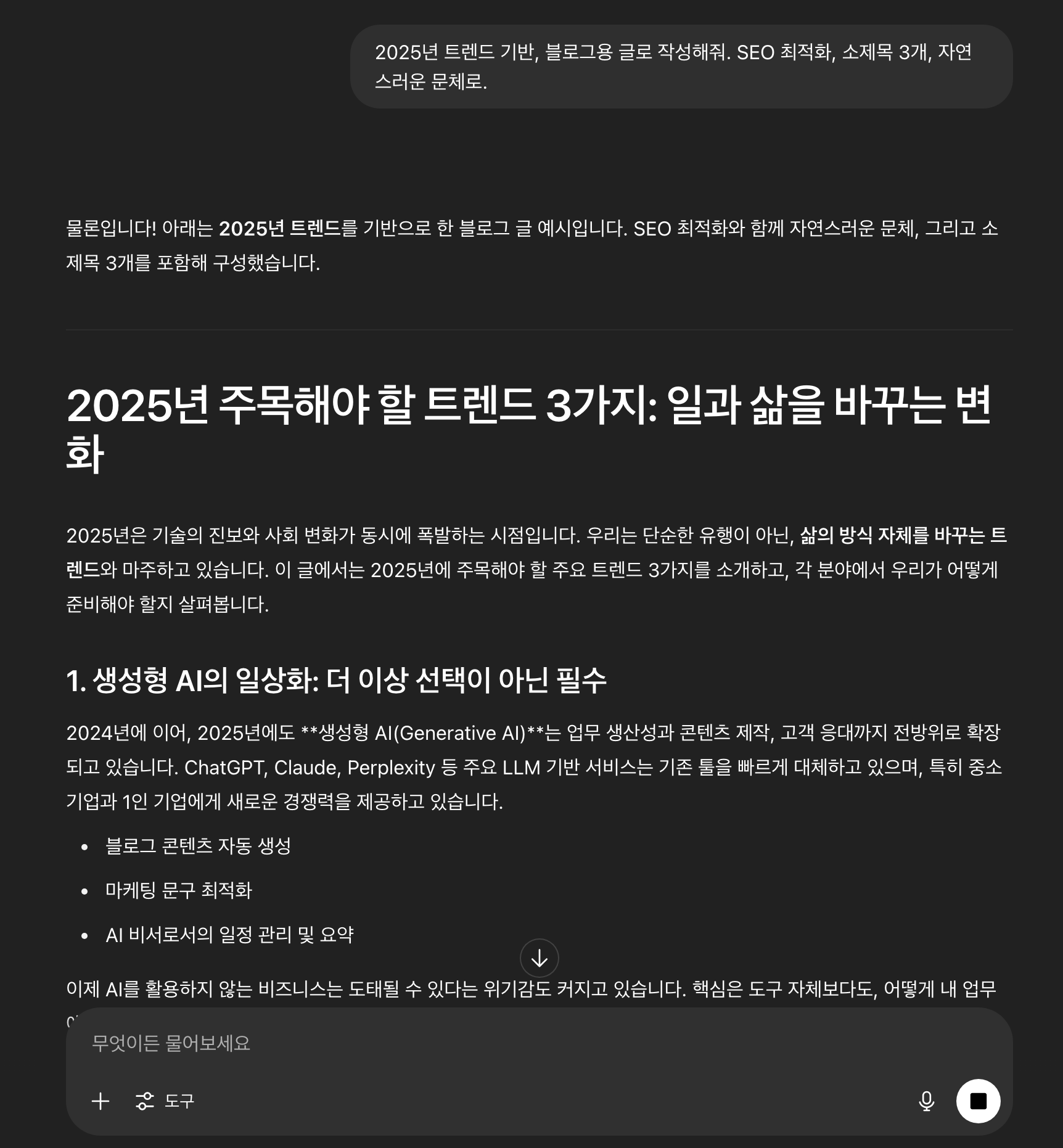“2025년 트렌드 기반, 블로그용 글로 작성해줘. SEO 최적화, 소제목 3개, 자연스러운 문체로.”