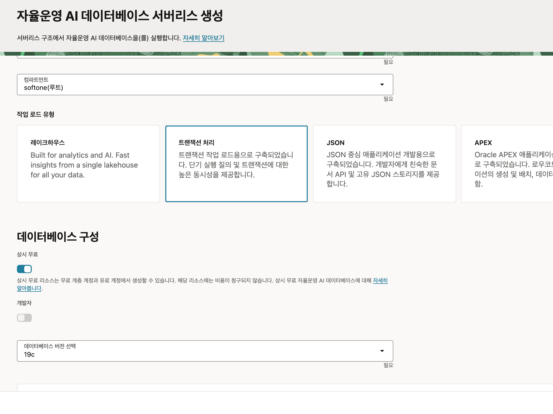 - 유형 선택: Autonomous Database 생성에서 Workload를 트랜잭션 처리(ATP)로 지정해요.