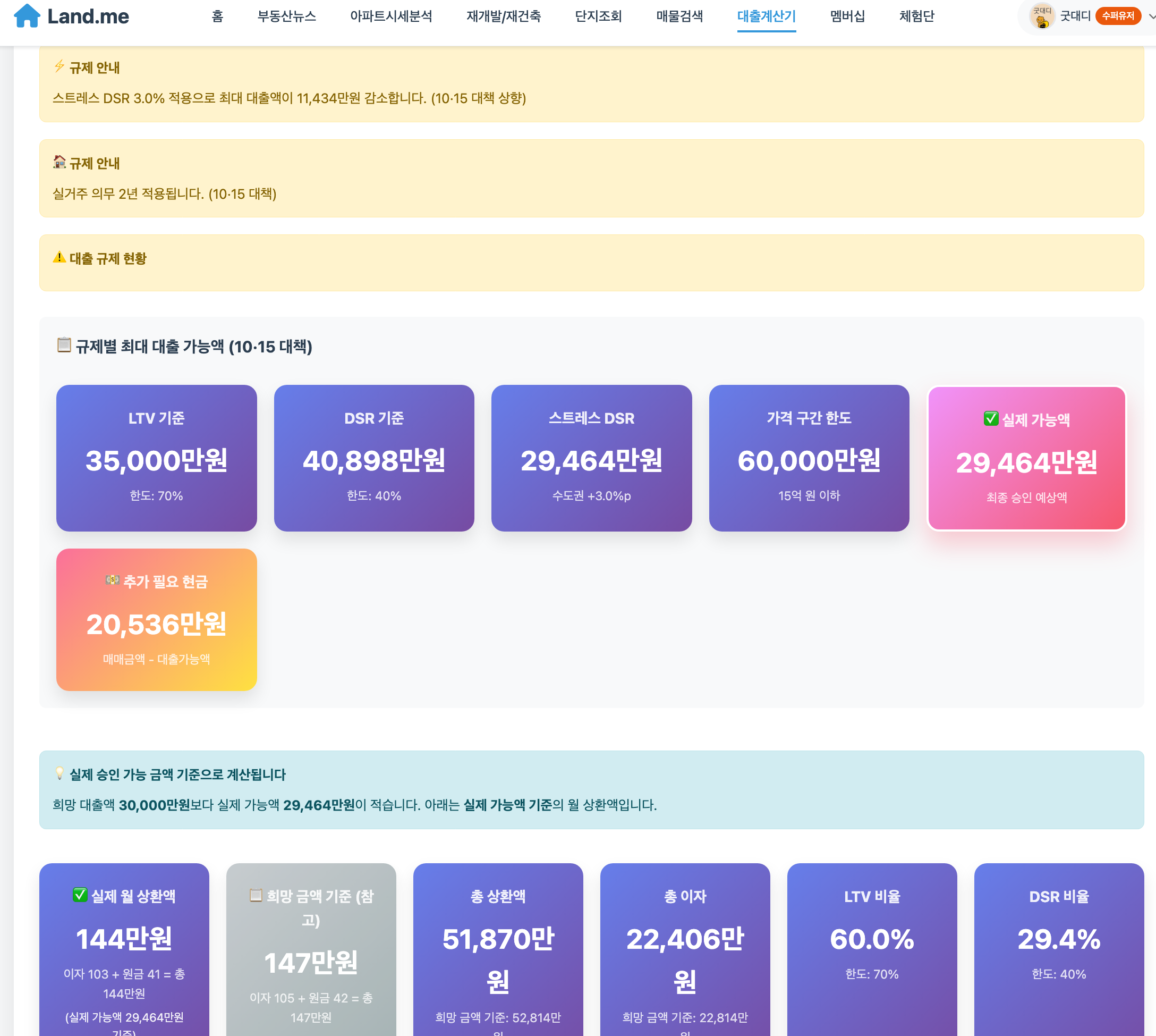 land.me.kr 대출계산기는 2025년 10.15 규제 내용을 모두 실시간으로 반영하면서, 사용자가 입력한 정보에 따라 실제 가능한 대출 금액과 한도를 빠르게 안내해줘요.