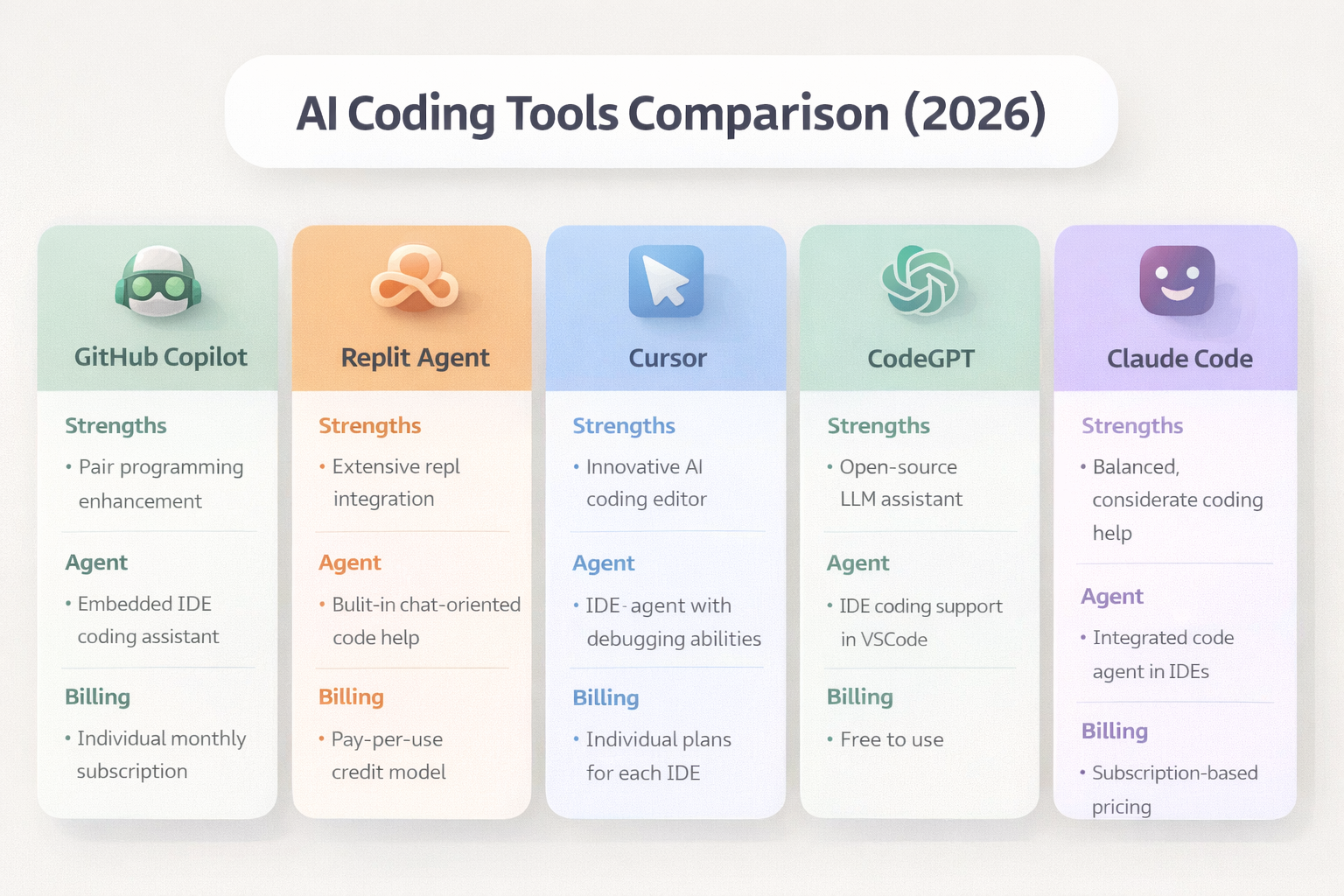 GitHub Copilot / Replit / Cursor / CodeGPT / Claude Code 비교 표