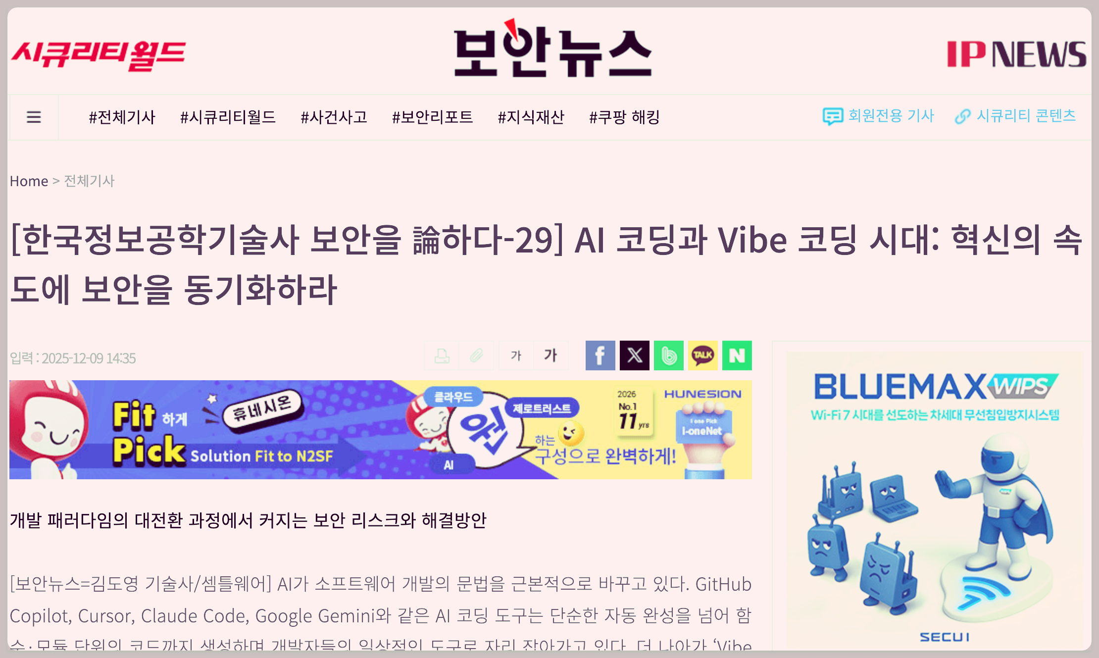 가장 우려되는 현실은 주니어 개발자들이 AI가 생성한 코드를 제대로 이해하지 못한 채 배포하고 있다는 점이에요. AI 코딩 과정에서 API 키, 비밀번호, 고객 데이터가 프롬프트나 코드와 함께 외부 서버로 전송되는 민감 데이터 유출 위험이 보고되었고, 존재하지 않는 라이브러리를 추천하는 '패키지 환각' 현상으로 공급망 공격의 위험도 증가했죠.