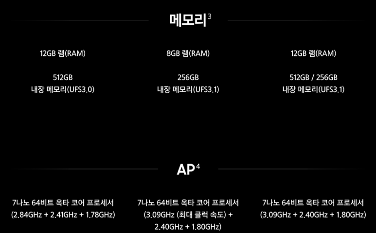 메모리는 기본 8G에서 12G RAM을 장착하고 저장 공간도 256GB에서 512GB로 세분화되었습니다.
