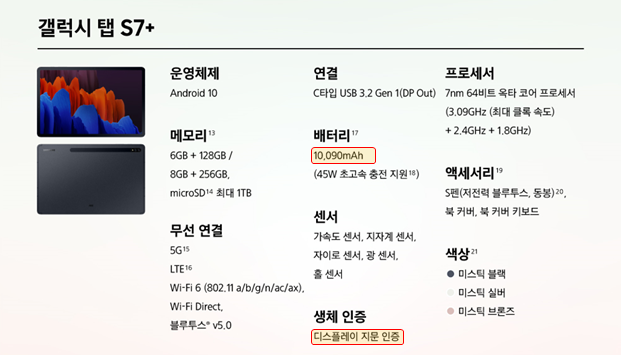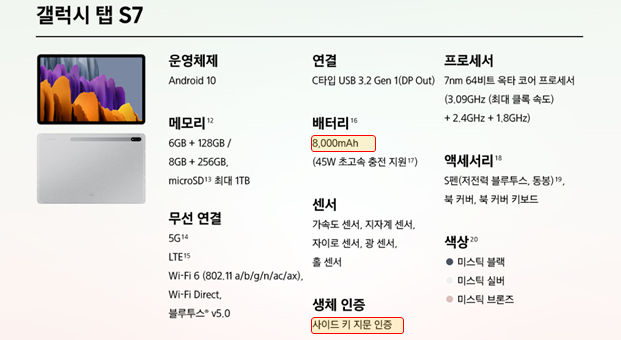 갤럭시 탭 S7+, S7 상세 스펙상 배터리와 생체인증이 차이가 나고 나머진 동일한 스펙을 가지고 있다.