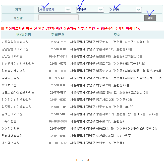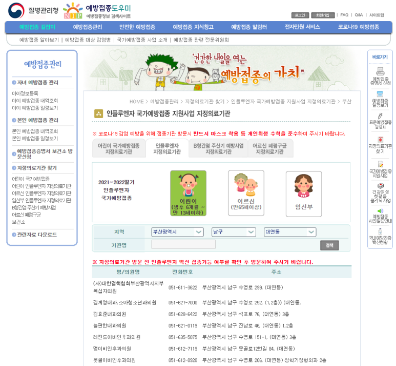 아래 화면으로 이동 후 인플루엔자 지정의료기관 선택하시면 어린이/어르신/임산부 지정 의료기관 전국 단위 검색 가능합니다.