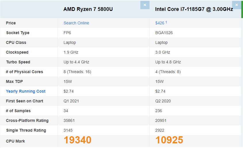 코어 수가 배로 많은 AMD R7 5800U가 코어 8개에 16쓰레드로 인텔 I7-1185G7 코어 4개에 8쓰레드보다 멀티 작업이 많은 모델링 작업은 훨씬더 유리합니다.