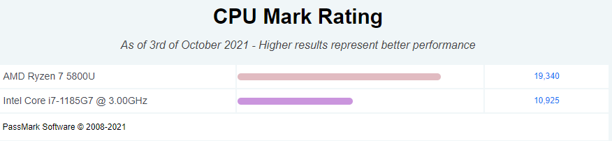 라이젠 7 5800u가 통합수치에서 더블 스코어를 나타냅니다.