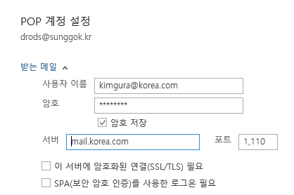 아래는 pop3 아웃룩 설정 방법입니다. 위 설정에서 본인의 경우 port를 1110으로 설정하였기에 아래와 같이 적용합니다.
