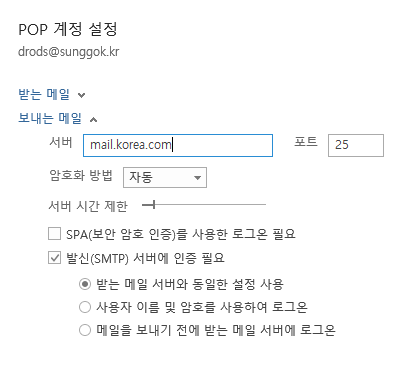 2. 보내는 메일 서버 설정